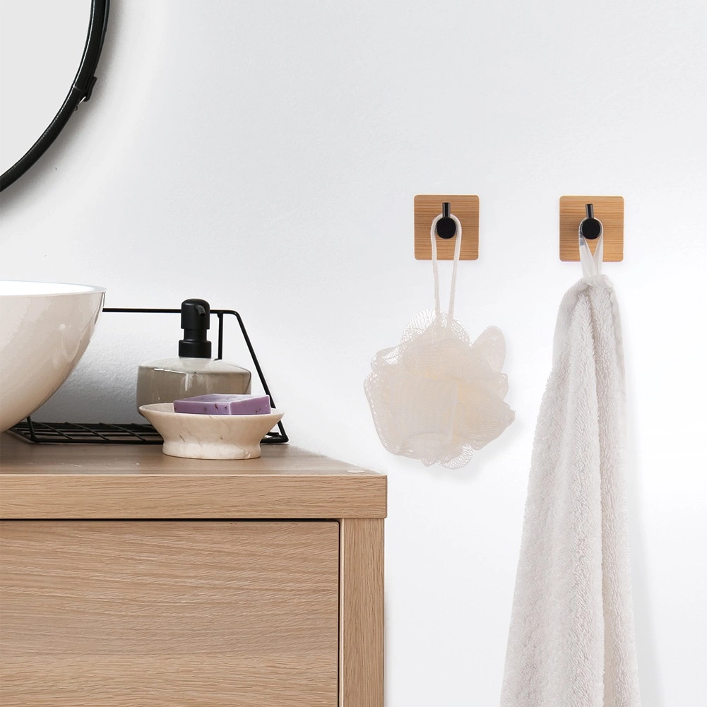 Cârligele stilate cu bază din bambus și știft metalic negru sunt proiectate pentru confortul zilnic. Datorită spatelui autoadeziv, instalarea este rapidă și curată – fără găurire, praf și unelte. Designul minimalist se potrivește perfect atât în interioare moderne, cât și în spații cu accente naturale.