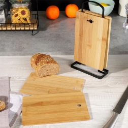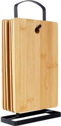 Setul de șase tocătoare de bucătărie din bambus, într-un suport elegant negru, aduce ordine și stil în orice bucătărie. Fiecare tocător are dimensiunile 22 × 14 × 0,4 cm, iar suportul 15 × 6 × 29 cm, astfel încât încape ușor pe blatul de lucru și păstrează tocătoarele mereu la îndemână.
