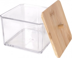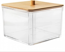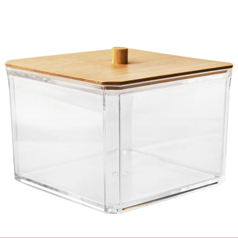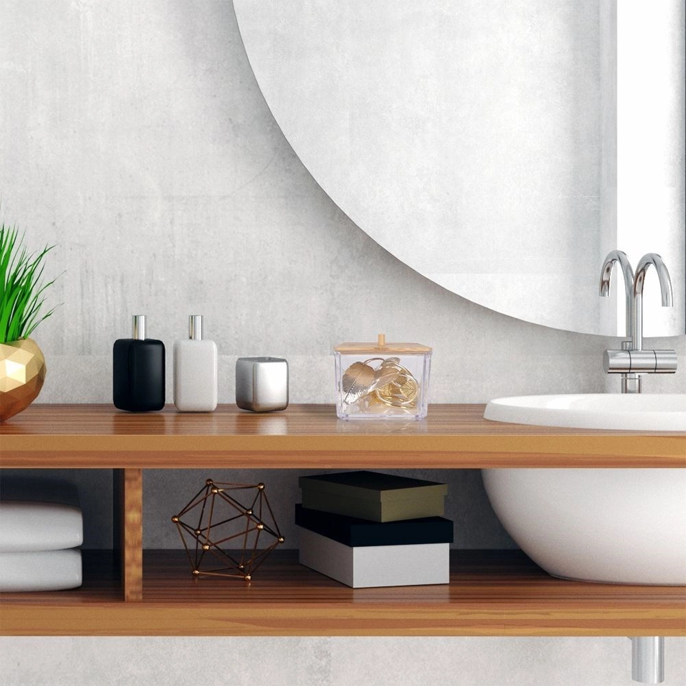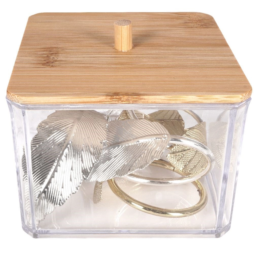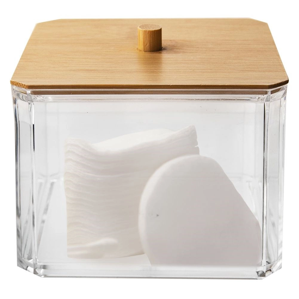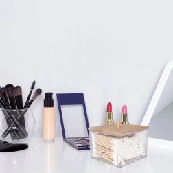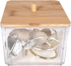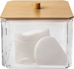 Această cutie elegantă pentru bețișoare de urechi combină pereți clari din plastic rezistent și aspectul natural al capacului din bambus cu un buton practic. Se potrivește perfect în baie, dormitor sau colțul de machiaj – păstrează mărunțișurile bine organizate și ferite de praf.