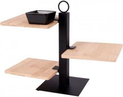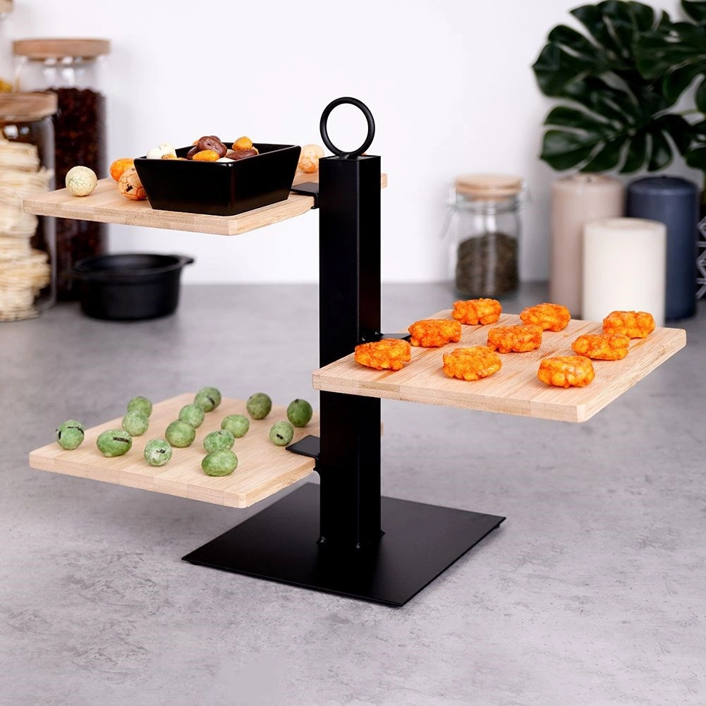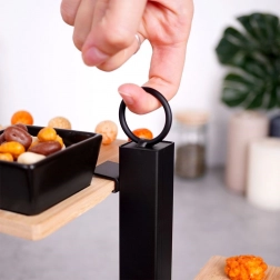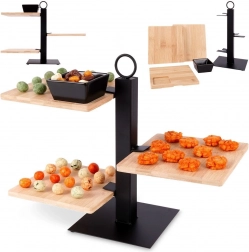 Construcția metalică robustă cu finisaj negru și baza pătrată stabilă (13 × 13 cm) garantează utilizarea în siguranță. Mânerul superior practic ușurează transportul. Etagiera este o alegere excelentă pentru petreceri acasă, bufete, cafenele și catering — se evidențiază pe candy bar, la brunch sau ca suport de servire pentru brânzeturi și mezeluri.