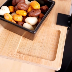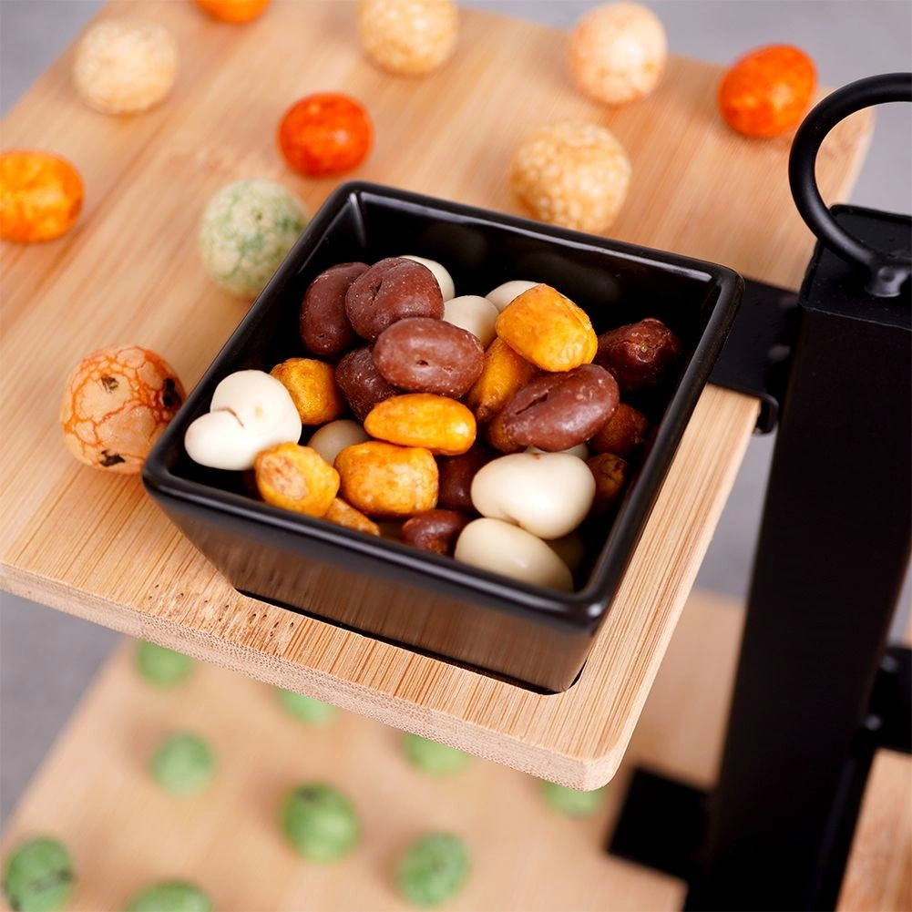 Această etagieră modernă cu trei niveluri îmbină bambusul natural cu metalul negru pentru o prezentare stilată a bunătăților dulci și sărate. Dimensiunile compacte de 32 × 32 × 26,5 cm economisesc spațiu pe masă, în timp ce cele trei tăvi pătrate (fiecare 14,5 × 14,5 cm) permit o aranjare clară și atrăgătoare a gustărilor. Este inclus și un bol ceramic (40 ml; 6,5 × 6,5 × 3 cm) pentru dipuri, sosuri sau nuci.