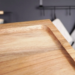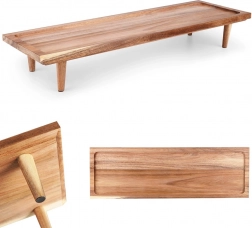 Această placă universală de servire cu picioare se remarcă prin design curat și funcționalitate. Datorită lemnului solid de salcâm, este rezistentă la umiditate și deformații, fiind ideală pentru utilizare zilnică în bucătărie și la mese festive. Marginile ridicate păstrează alimentele la locul lor și facilitează transportul.