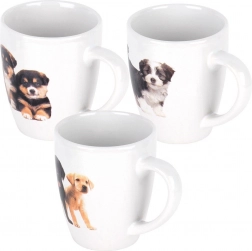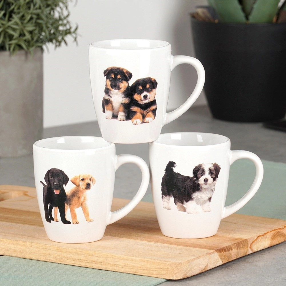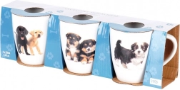 Răsfață-te cu un set de trei căni ceramice cu un motiv delicat de căței, care îți va lumina cafeaua de dimineață și ceaiul de după-amiază. Datorită volumului compact de 220 ml, sunt ideale pentru espresso lungo, cappuccino, cacao și ceaiuri din plante. Cănile sunt din ceramică albă de calitate, cu imprimeu rezistent cu cățeluși și glazură lucioasă.