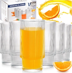 Set elegant de șase pahare înalte cu volum de 320 ml, din sticlă striată de calitate. Oferă priză sigură, aspect modern și utilizare versatilă pentru apă, limonade, sucuri, băuturi și ceaiuri cu gheață. Potrivite pentru mașina de spălat vase, ideale pentru casă, restaurant și bar.