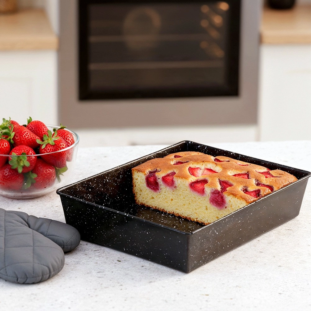 Formă de copt universală din granit, realizată din oțel carbon rezistent, pentru o coacere uniformă impecabilă. Datorită stratului antiaderent cu aspect granit, aluatul se desprinde ușor, iar forma se curăță simplu. Ideală pentru prăjituri, gratinuri, carne și legume, sigură la cuptor până la 230 °C.