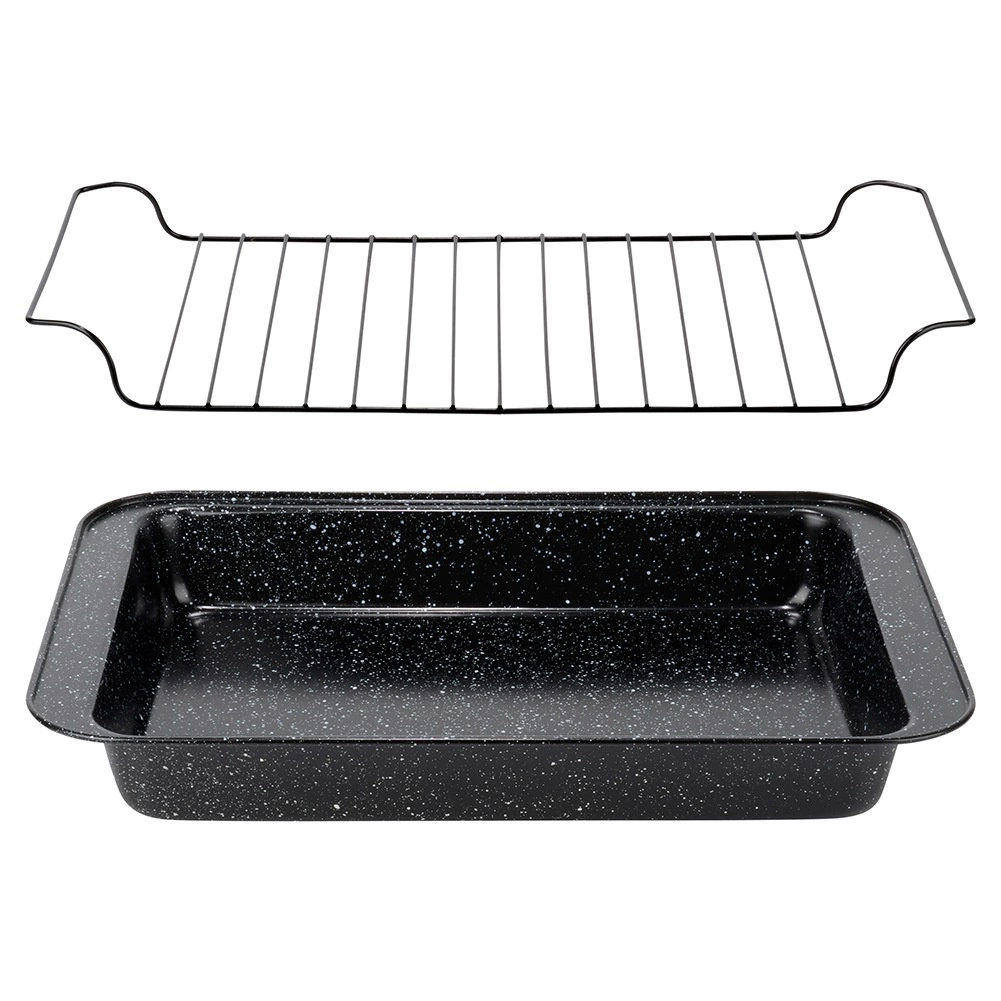 Această tavă robustă de 37,5 × 25,5 × 5 cm este o alegere excelentă pentru gătitul zilnic și pentru fripturile de sărbătoare. Finisajul antiaderent din granit previne lipirea chiar și cu o cantitate minimă de grăsime și permite o preparare mai sănătoasă a mâncărurilor. Grătarul metalic detașabil menține carnea deasupra sucurilor, astfel încât se coace uniform pe toate părțile.