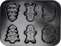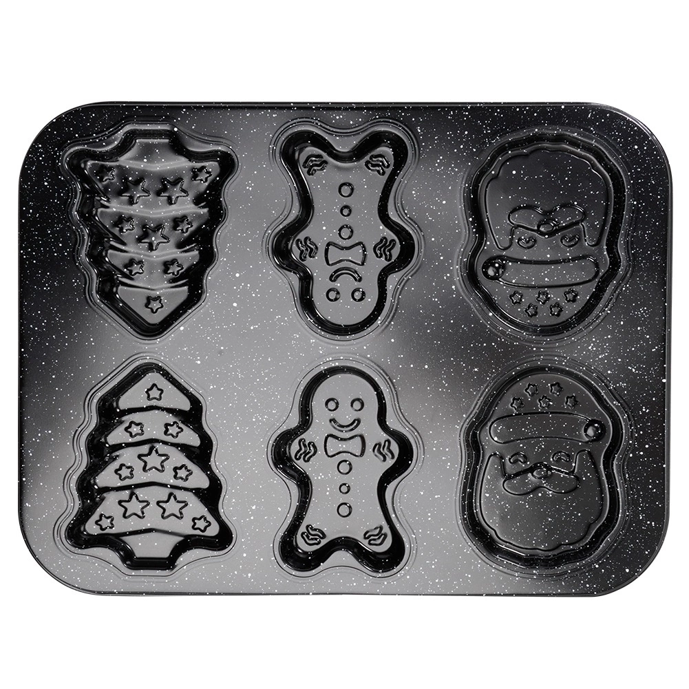 Forma oferă șase cavități adânci în trei motive festive îndrăgite – Moș Crăciun, brăduț de Crăciun și omuleț din turtă dulce. Este excelentă pentru turtă dulce, biscuiți fragezi, biscuiți crocanți, mini checuri și mini cheesecake-uri.