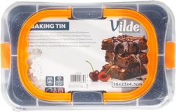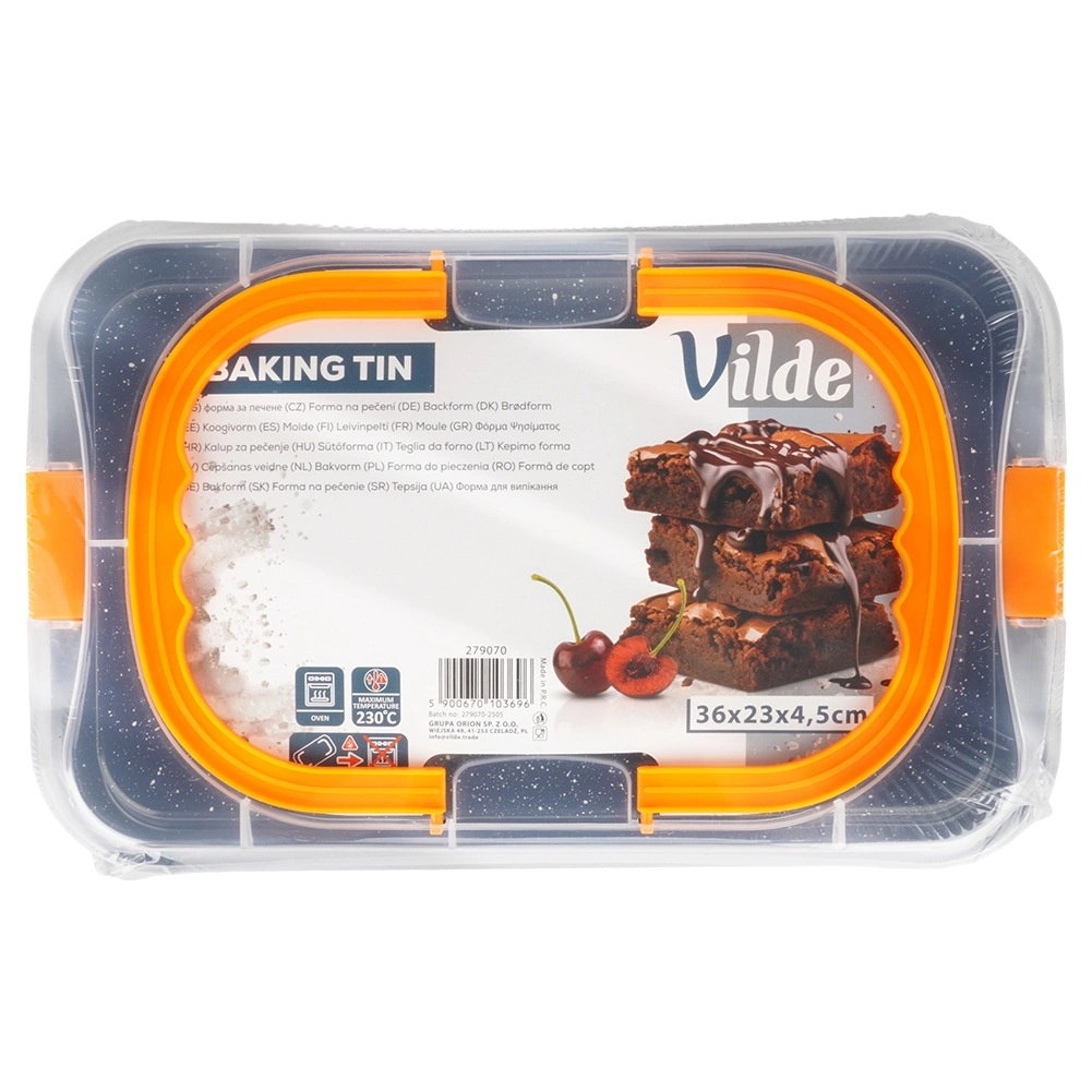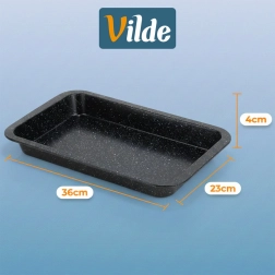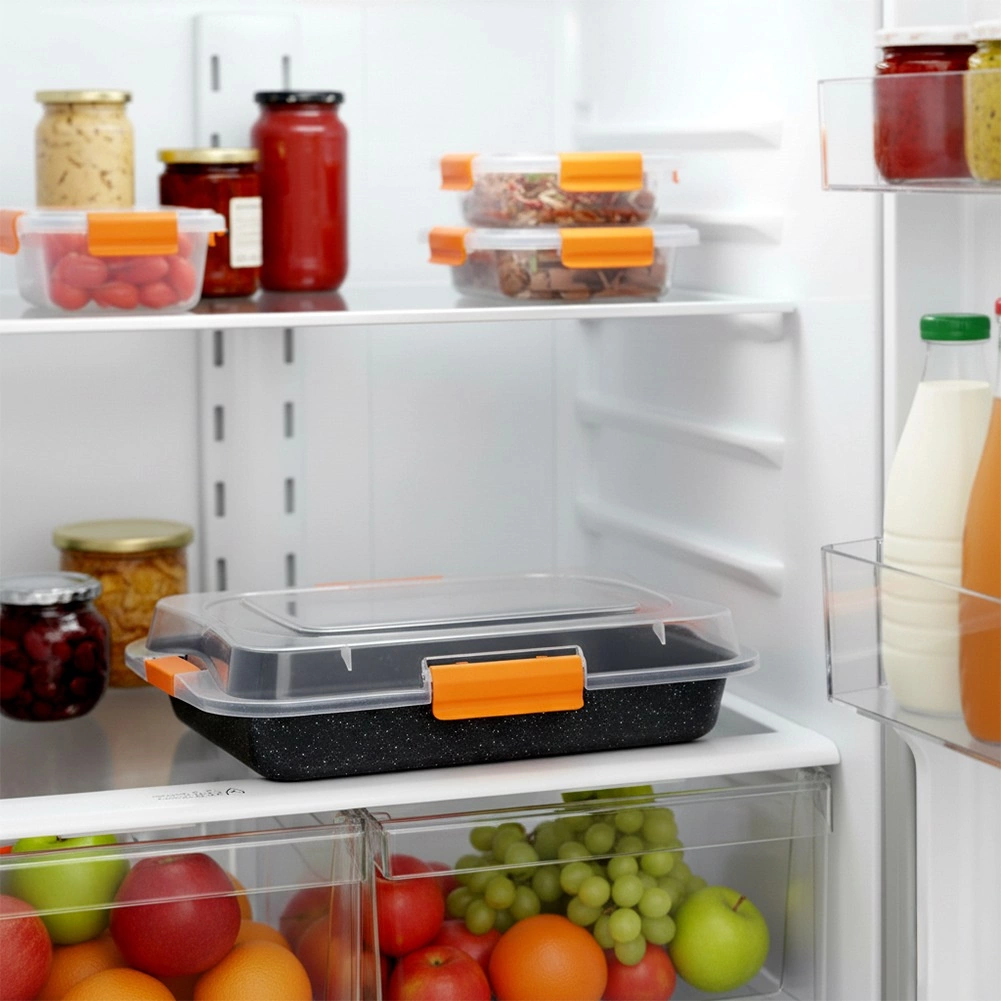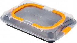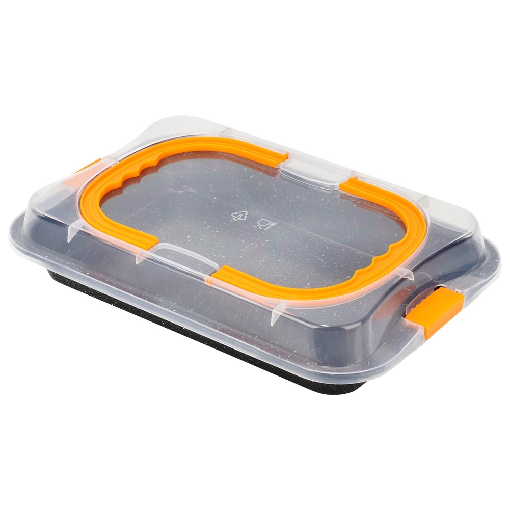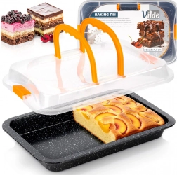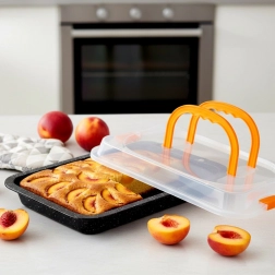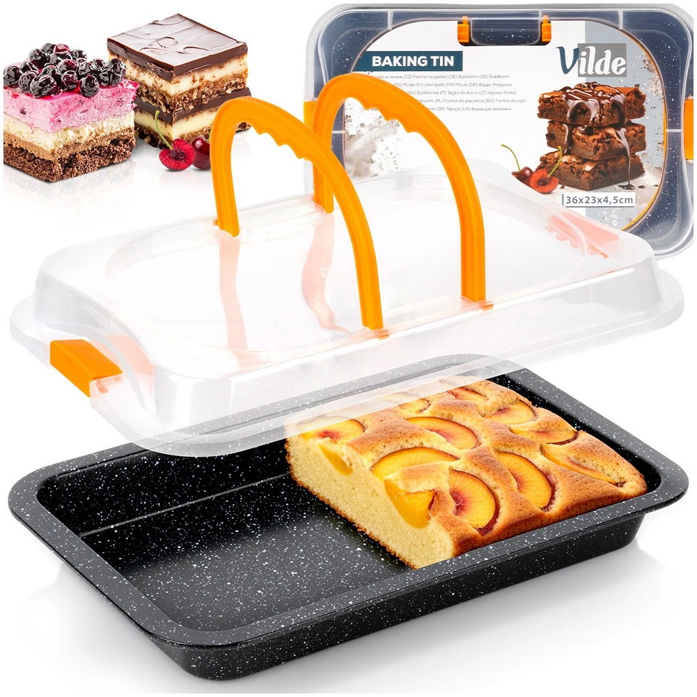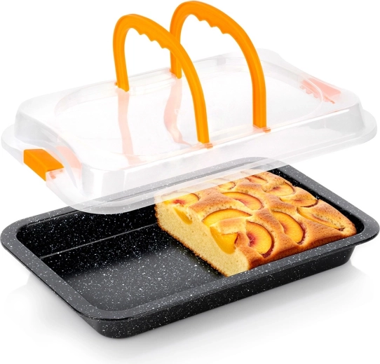 Această tavă dreptunghiulară (36 × 23 × 4,5 cm) îmbină robustețea oțelului carbon cu rezistența stratului antiaderent granitat, care previne lipirea și ușurează curățarea. Capacul transparent cu mânere rabatabile portocalii permite transportul sigur și depozitarea igienică a deserturilor și a preparatelor sărate.