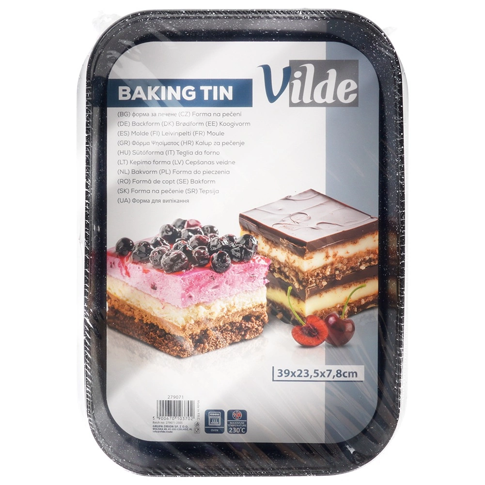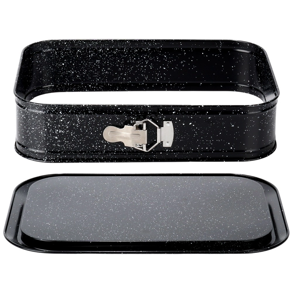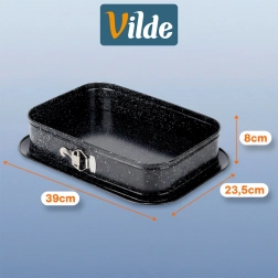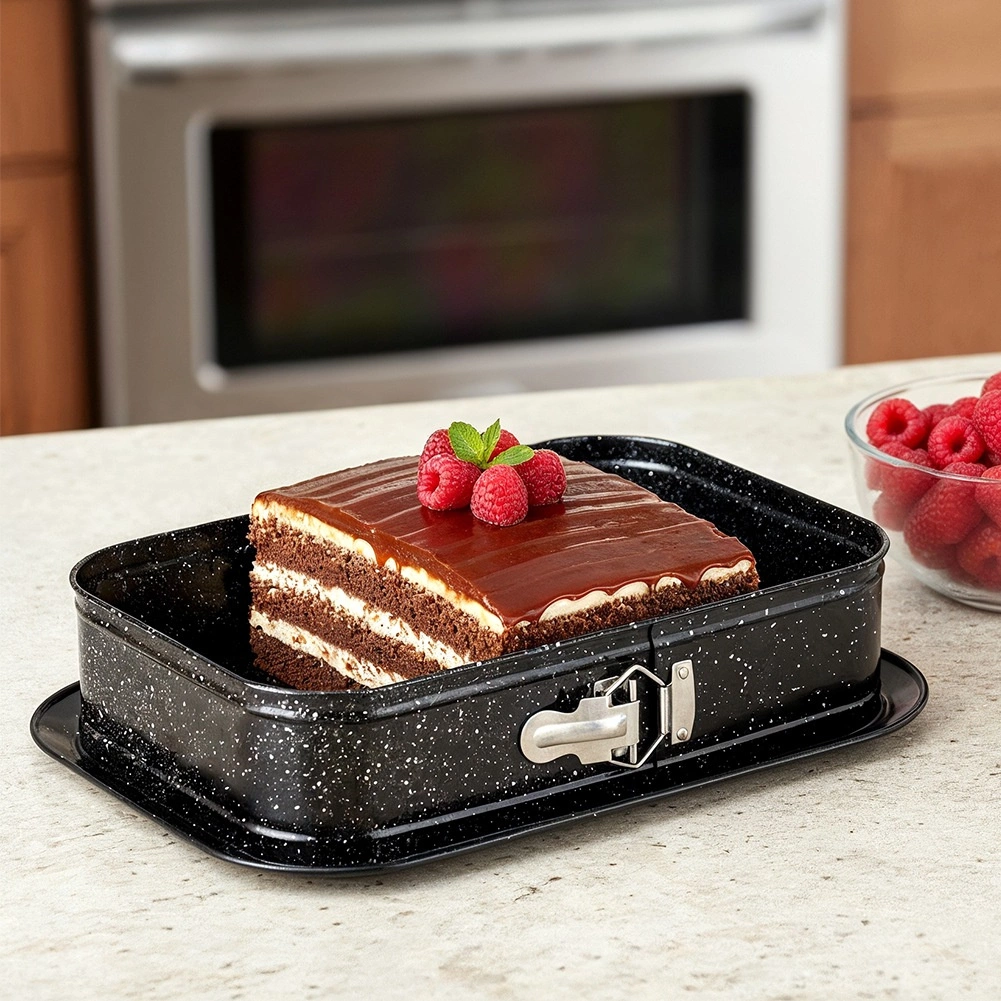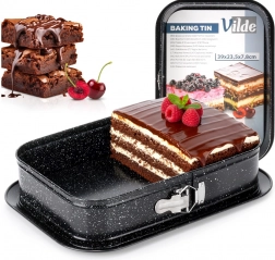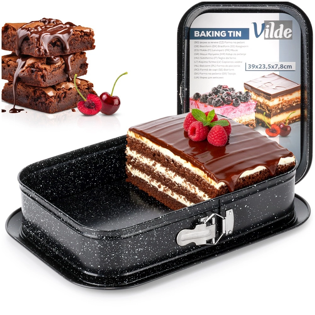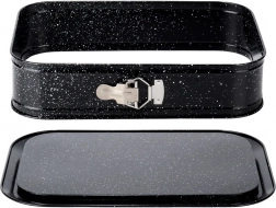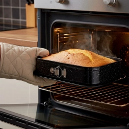 Forma dreptunghiulară detașabilă este o alegere excelentă pentru coacerea de zi cu zi. Oțelul carbon cu finisaj granit rezistă la temperaturi de până la 230 °C, nu absoarbe mirosurile și, datorită conductivității excelente, distribuie uniform căldura. Marginea detașabilă și baza amovibilă permit scoaterea fără probleme chiar și a deserturilor fragile, fără deformare.