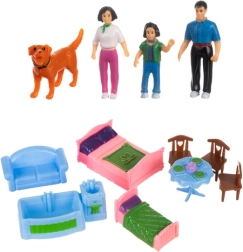 Bucătărie, living cu șemineu, dormitor, cameră pentru copii, baie și hol. Incluse sunt figurinele familiei, un cățel și mobilier pentru joacă imediată.