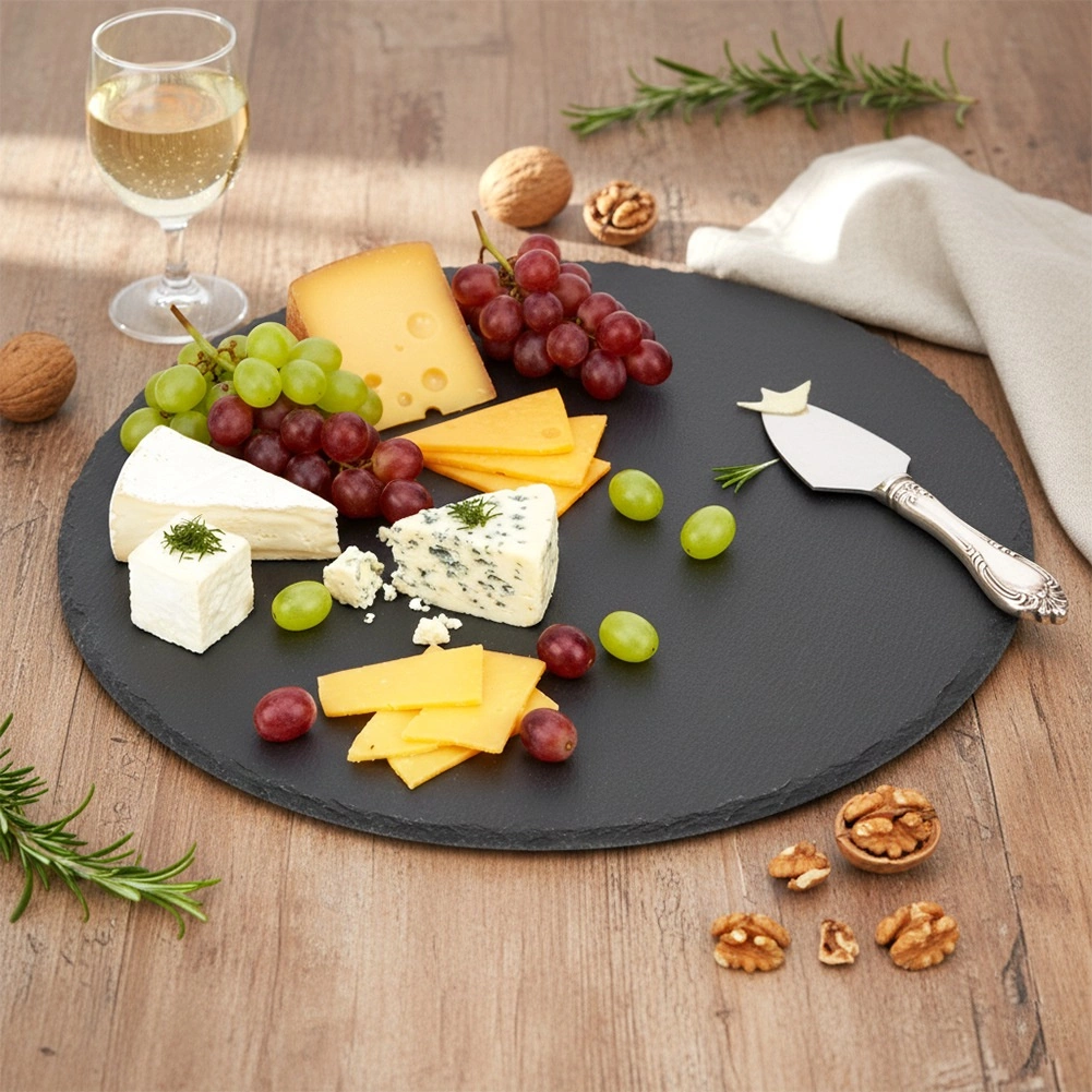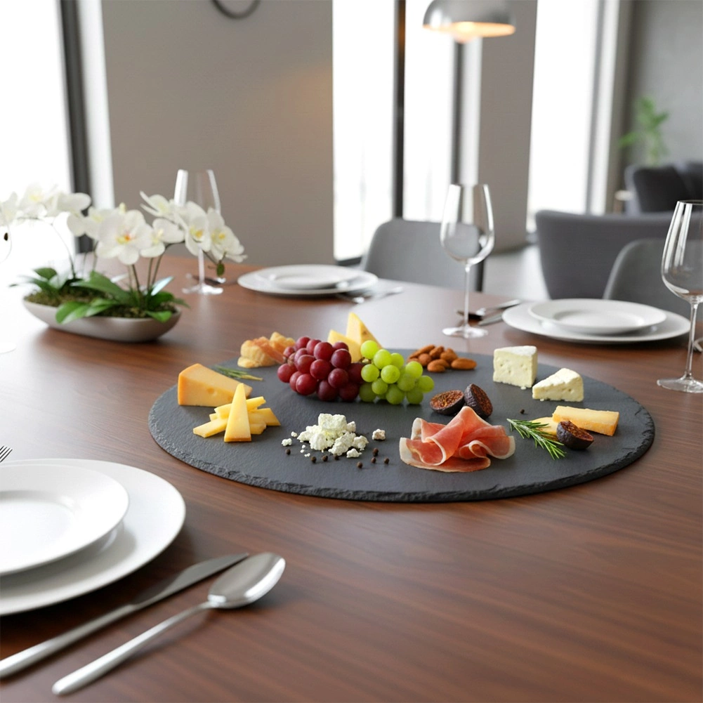 Suprafața mată de piatră și marginile natural cioplite oferă fiecărei mese un aspect elegant – ideal pentru platouri de brânzeturi, charcuterie și deserturi.