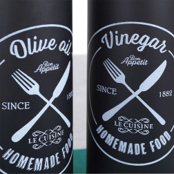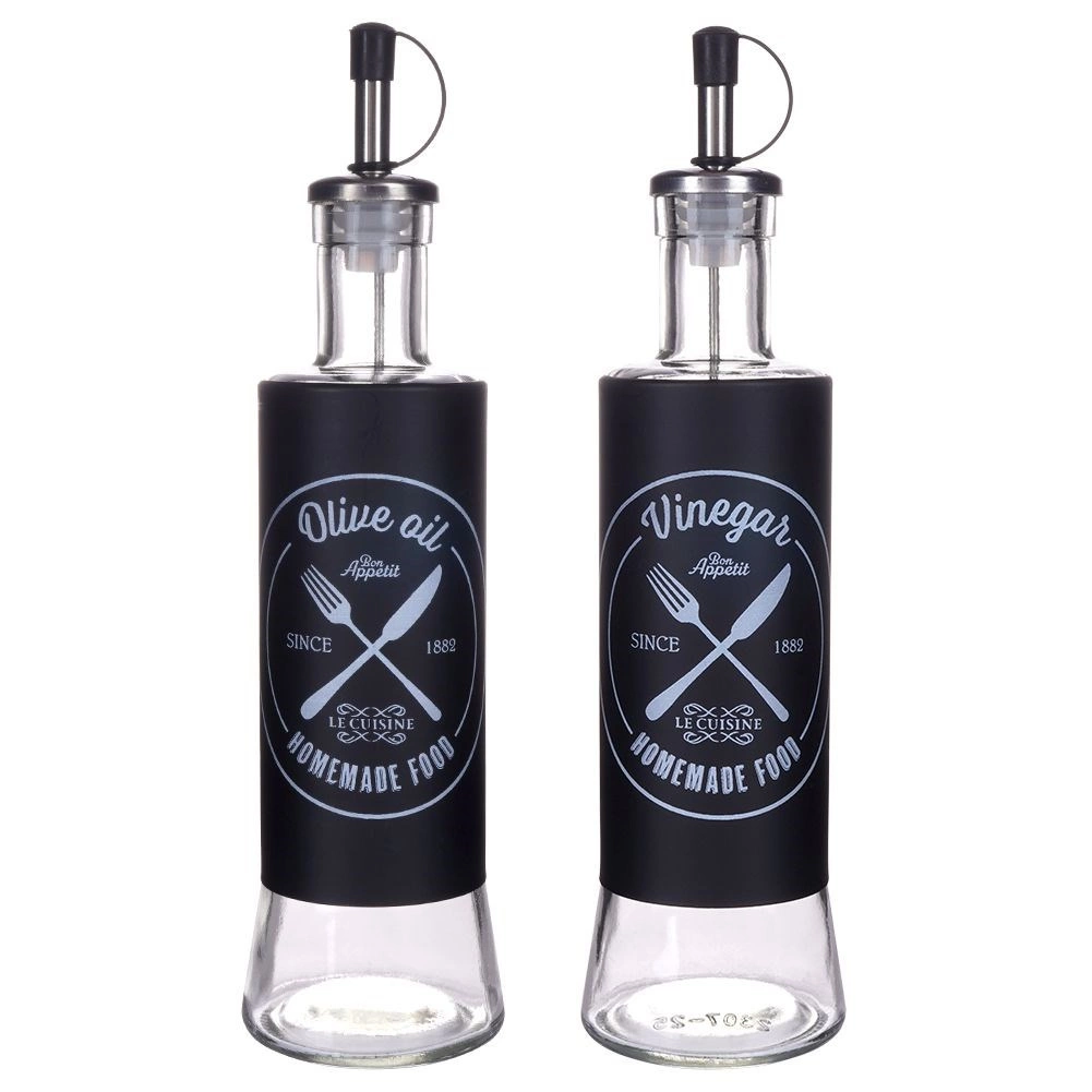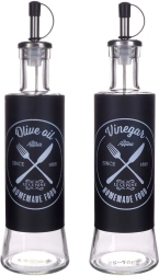 Set elegant de două sticle din sticlă, câte 300 ml, pentru ulei de măsline și oțet, cu dozator metalic și capac de protecție. Oferă dozare precisă, turnare fără picurare și un design modern negru cu inscripții albe pentru distingere ușoară. Ideal pentru bucătărie și gastronomie.