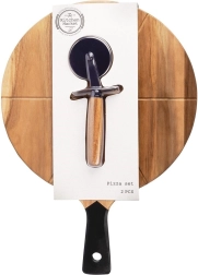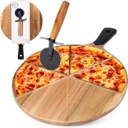 Set practic pentru iubitorii de pizza: placă din lemn de salcâm cu caneluri de ghidare pentru 6 felii egale și tăietor de pizza metalic cu mâner din lemn. Utilizare pe ambele părți, servire stilată, transport comod datorită mânerului lung și rezistență la umiditate și la temperaturi de până la 70 °C.