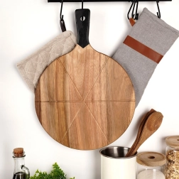Mânerul lung cu orificiu permite transport sigur și agățare comodă pe bara de bucătărie. Lemnul de salcâm este rezistent la umiditate și în același timp ușor, astfel că placa se manevrează facil. Pentru o durată de viață îndelungată, recomandăm spălare manuală și întreținere periodică cu ulei pentru lemn.
