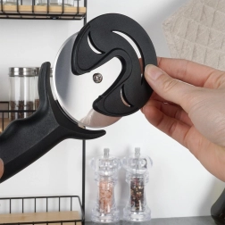 Tăietor de pizza practic, cu disc rotund din oțel inoxidabil și capac de protecție, oferă tăiere comodă și sigură. Are un mâner ergonomic cu orificiu pentru agățare, taie ușor chiar și aluatul mai gros și, datorită rotiței rotative ascuțite, împarte pizza în felii uniforme. Materiale durabile, depozitare sigură cu capac și întreținere ușoară.