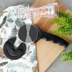 Descoperă tăietorul de pizza fiabil, cu disc din inox rezistent, care trece lin prin aluat subțire sau gros. Mânerul ergonomic stă perfect în mână și oferă o prindere sigură, în timp ce capacul de protecție permite depozitarea în siguranță în sertar.