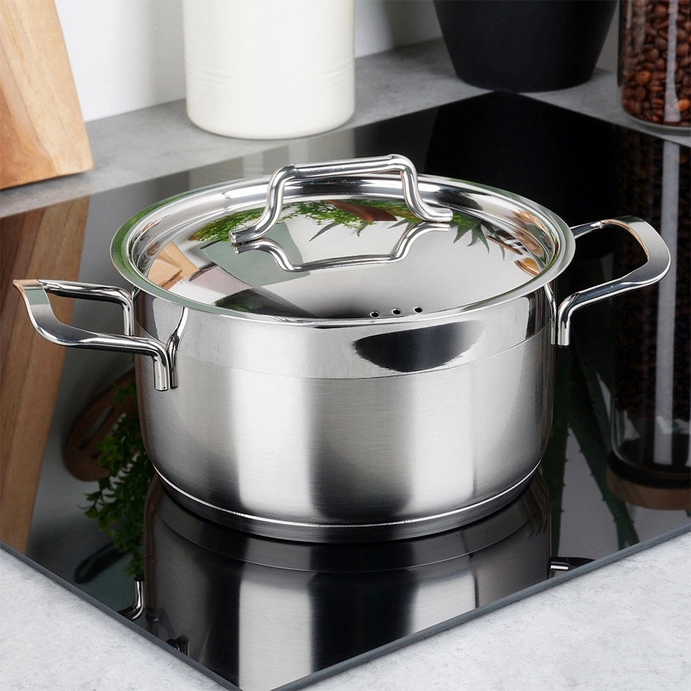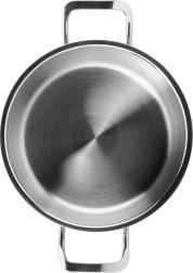 Capacul din oțel, perfect ajustat, are orificii de aerisire pentru evacuarea controlată a aburului. Mânerele laterale comode facilitează manipularea, fie că gătiți supe, sosuri sau înăbușiți legume și carne. Oala este potrivită pentru gaz, electric, vitroceramică și inducție și se poate spăla în mașina de spălat vase.
