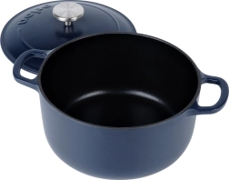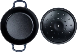 Această oală din fontă LITINA cu diametrul de 22 cm îmbină materialul tradițional cu o finisare modernă. Fonta masivă conduce și reține foarte bine căldura, în timp ce interiorul neted, emailat, minimizează lipirea și simplifică întreținerea. Glazura exterioară bleu închis adaugă stil bucătăriei, iar oala poate fi folosită direct pentru servire – datorită fontei, preparatele rămân calde mult timp.