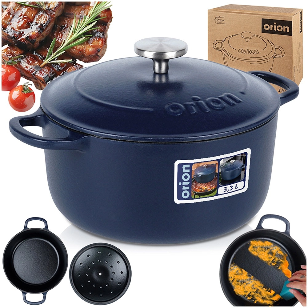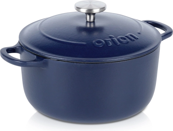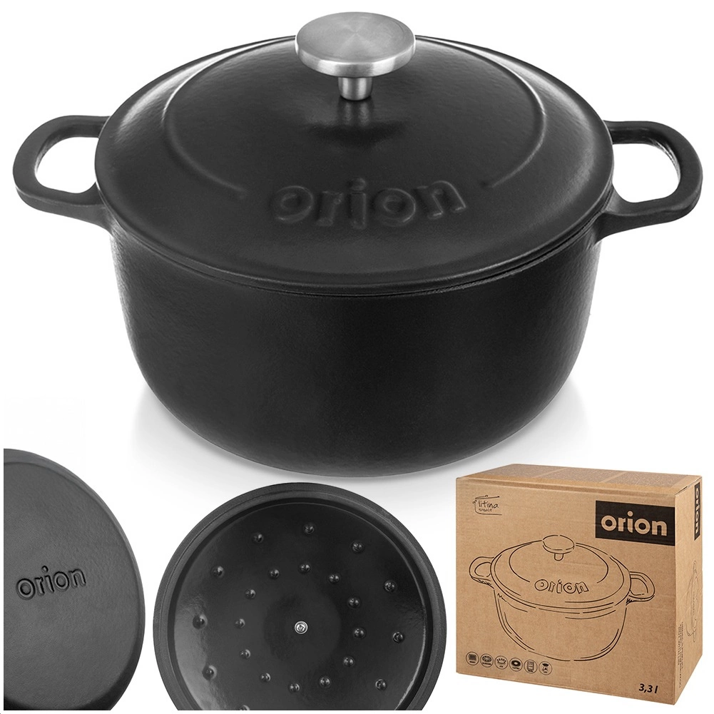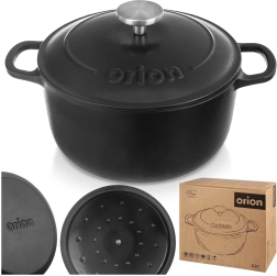 Oală universală din fontă cu capac, volum 3,3 l, pentru gătit zilnic și înăbușire lentă. Datorită distribuției uniforme a căldurii, acumulării îndelungate și rezistenței până la 250 °C, este ideală pentru supe, gulașuri și fripturi. Interiorul emailat facilitează gătitul, servirea și curățarea, iar mânerele laterale robuste și butonul din inox al capacului asigură manipularea în siguranță. Calitate verificată marca ORION.