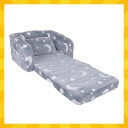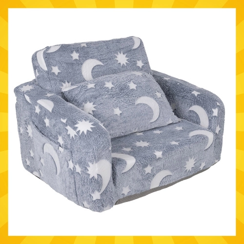 Confort moale și distracție într-unul – fotoliul extensibil pentru copii Kruzzel se transformă ușor într-o șezlong pentru citit, relaxare și povești. Foarte ușor, sigur și simplu de transportat, cu buzunar lateral practic și husă plușată fină. Luna și steluțele fluorescente luminează delicat în întuneric, creând o atmosferă liniștitoare pentru un somn odihnitor.