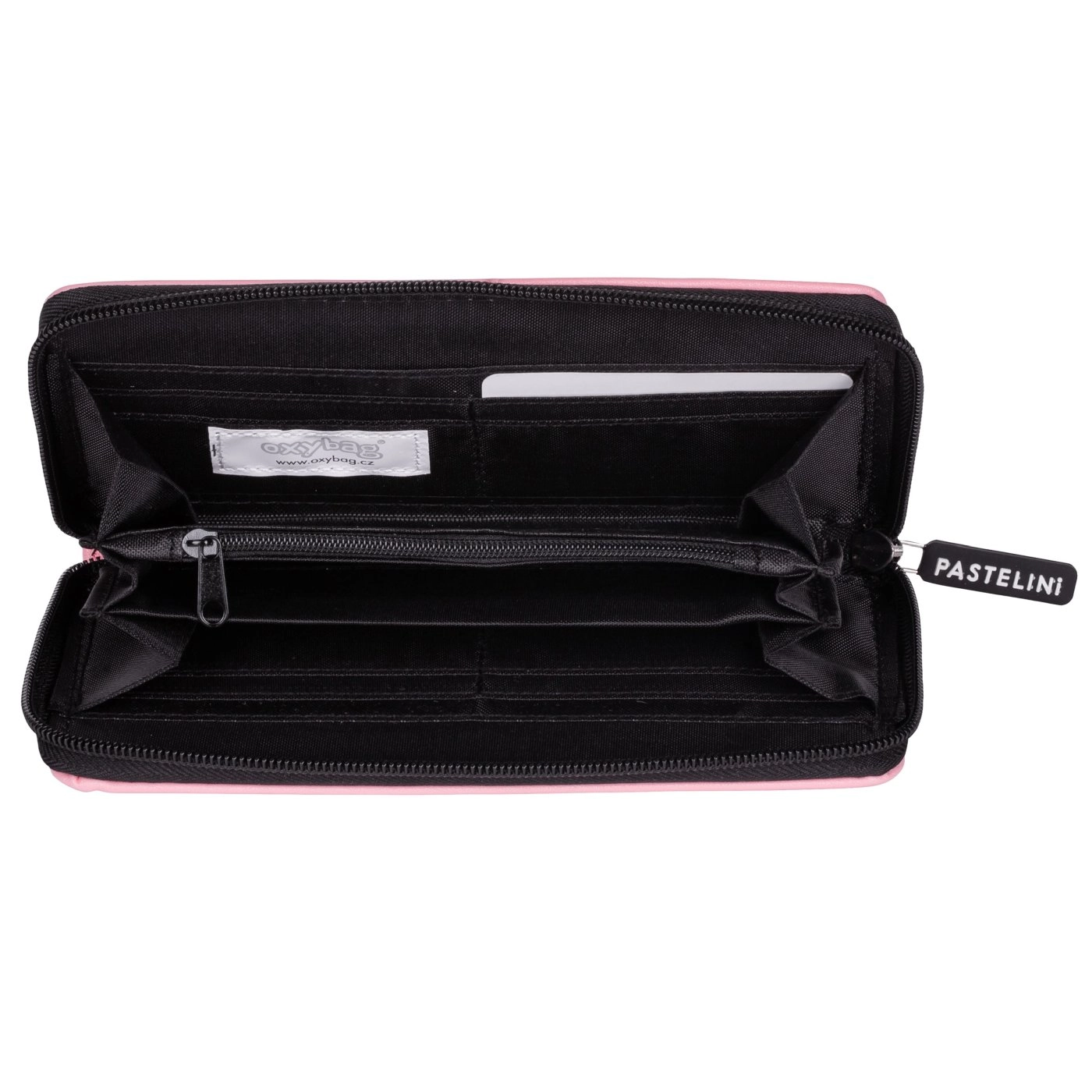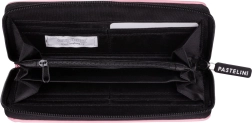 Portofel roz stilat, cu fermoar perimetral și logo minimalist PASTELINI, păstrează în siguranță bancnotele și cardurile și se potrivește perfect în mână.