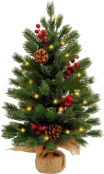 Brad artificial compact, cu înălțimea de cca 60 cm, care luminează frumos orice interior. Are iluminare LED caldă cu 3 moduri, ace realiste, decor cu bobițe roșii și conuri naturale și bază stabilă îmbrăcată în iută. Include 3× baterii AG13 pentru utilizare imediată.