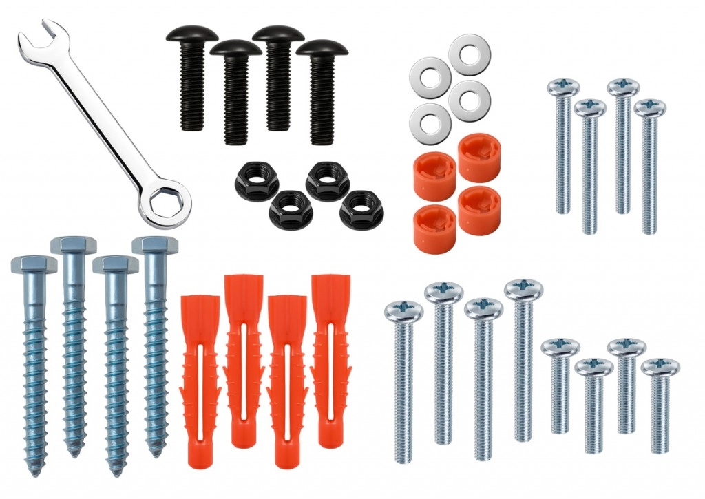 Include set de șuruburi, dibluri, șaibe și cheie – tot ce aveți nevoie pentru o montare sigură și curată pe perete.