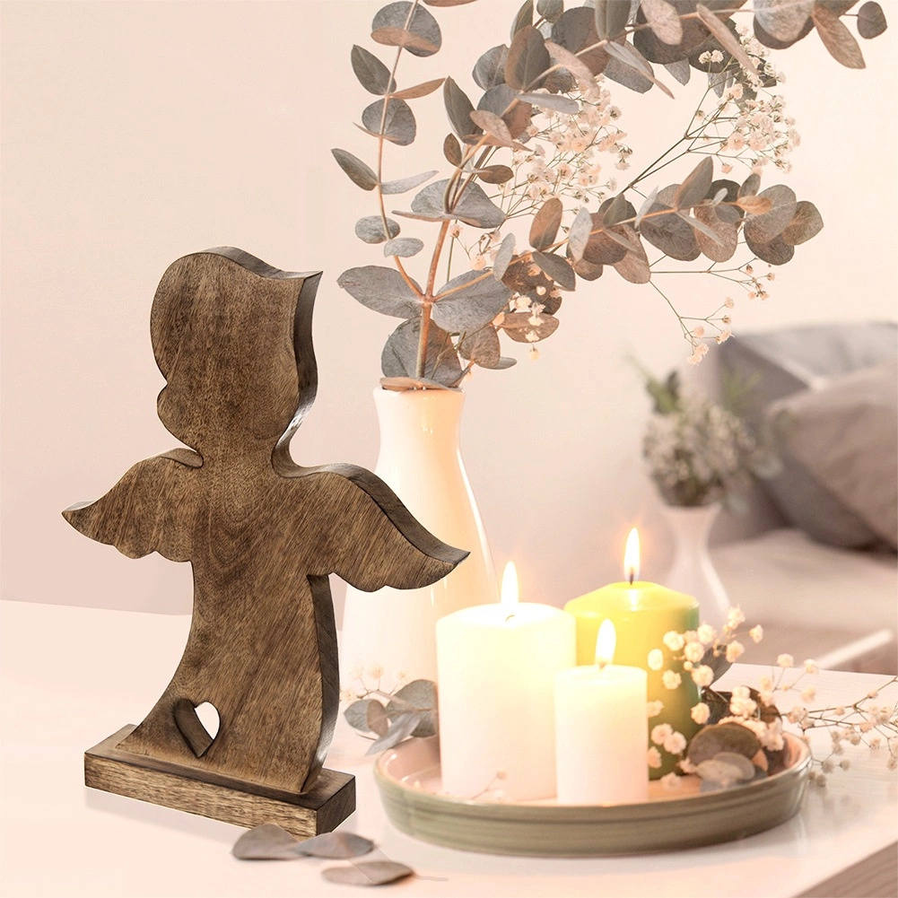 Figurina îngeraș din lemn de mango de calitate se remarcă prin aspectul natural și liniile curate. Datorită soclului solid, este stabilă și pregătită pentru expunere imediată în living, dormitor, hol sau birou. Forma minimalistă, cu decupaj în inimă, subliniază atmosfera primitoare a casei, mai ales în perioada Crăciunului, dar și pe tot parcursul anului.