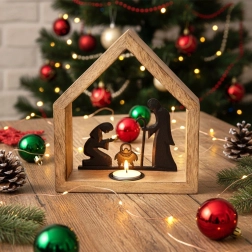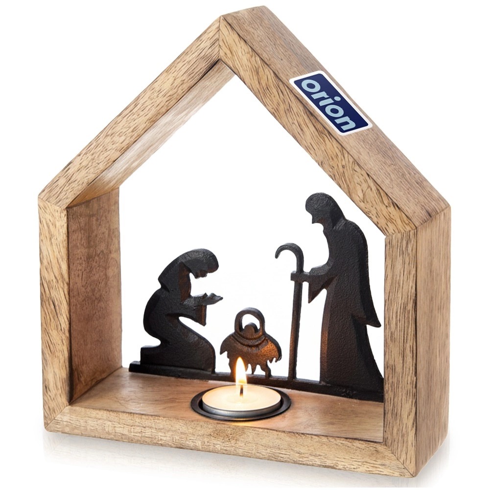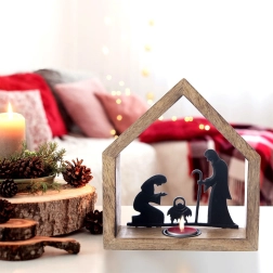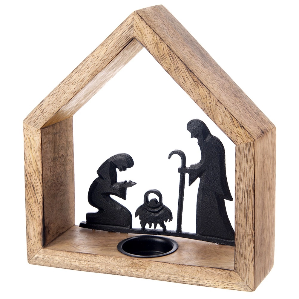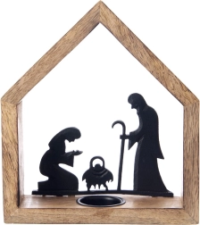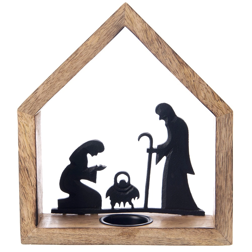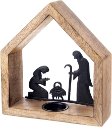 Un suport de lumânare stilat în formă de căsuță, cu motivul ieslei, din lemn natural de mango și metal negru, aduce în interior o atmosferă caldă și festivă. Are un locaș frezat pentru lumânare tip pastilă (tealight) cu diametrul de până la 4 cm, bază stabilă și un design rustic care se evidențiază pe masă, pe comodă sau pe pervaz.