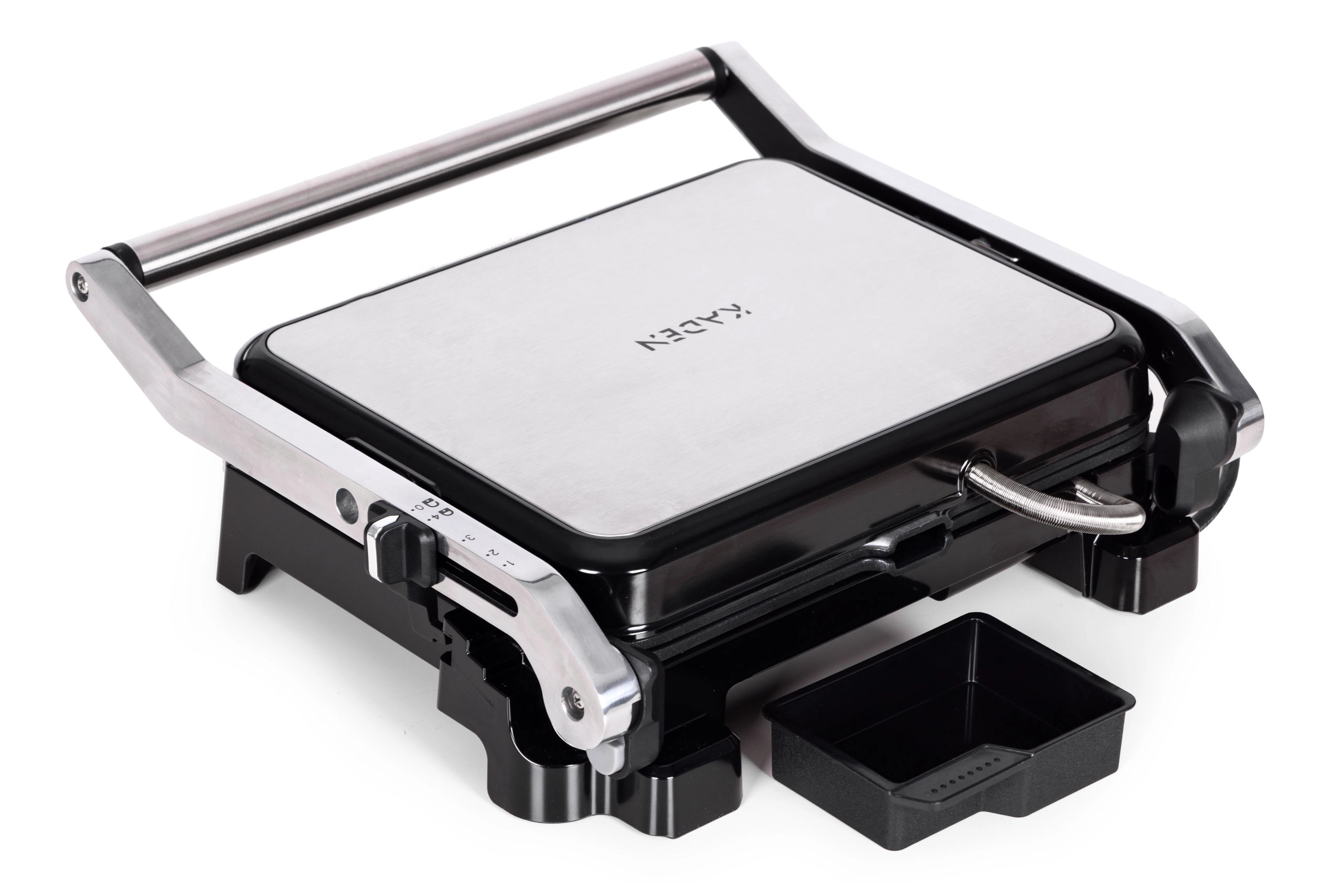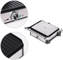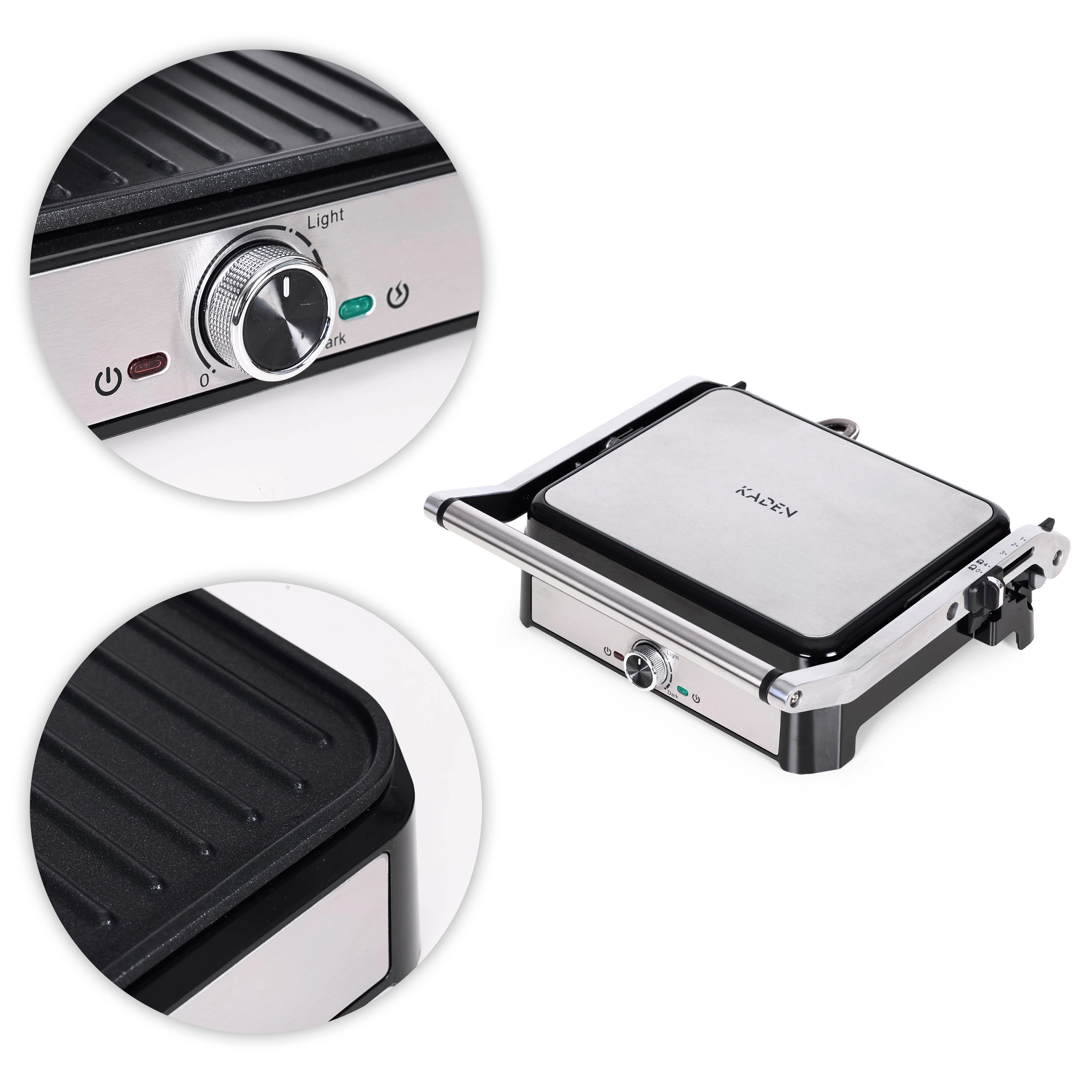 Bucurați-vă de grătar acasă tot timpul anului. Grătarul tip contact KADEN combină încălzirea rapidă, distribuția uniformă a căldurii și detalii practice, făcându-l alegerea ideală pentru panini, toasturi, carne și legume. Plăcile striate lasă un aspect atractiv de grilaj și ajută la evacuarea excesului de grăsime în tăvița detașabilă.