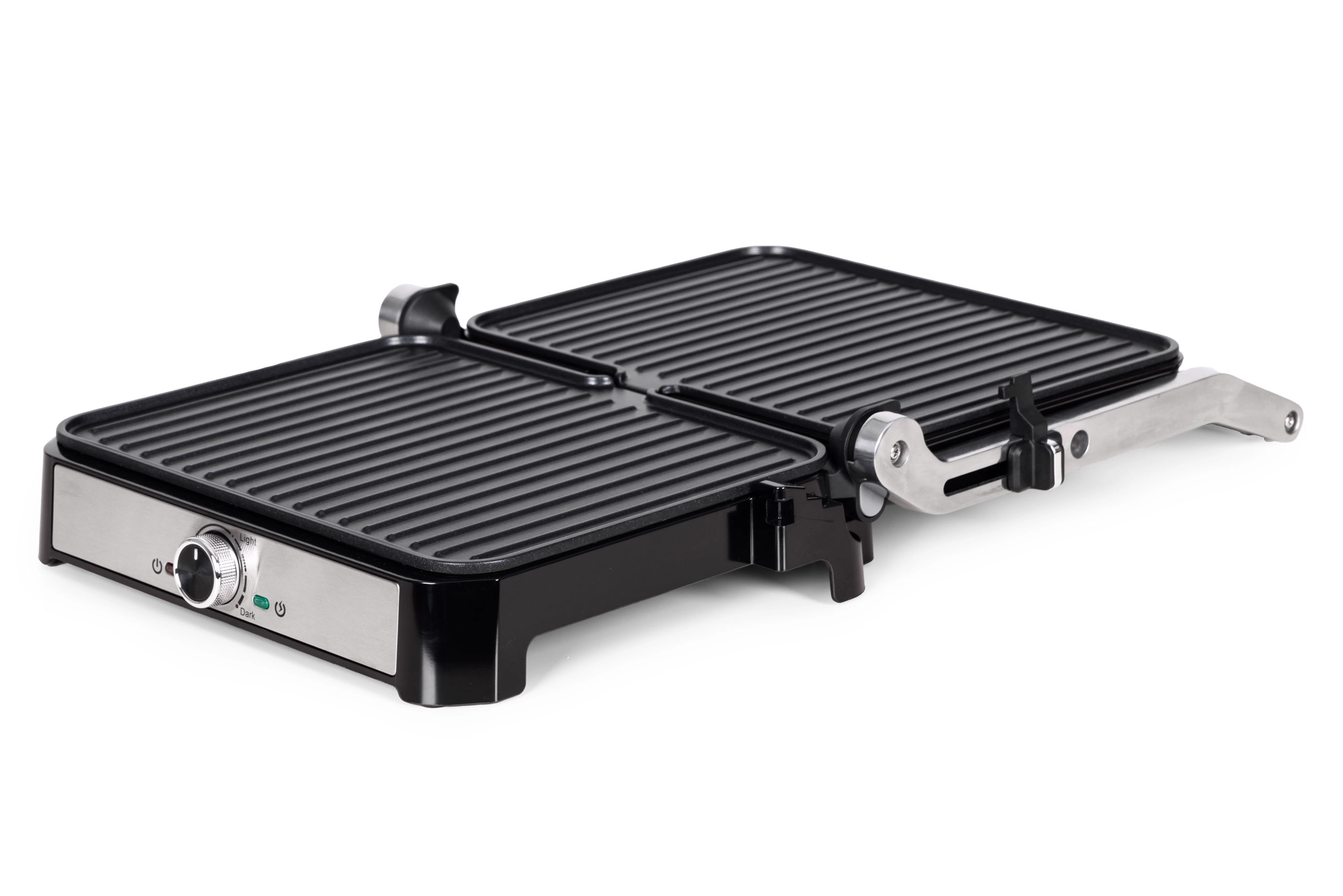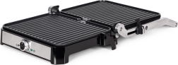 Prin apăsarea unui singur buton, deschideți complet grătarul și obțineți o suprafață mare, cu două plăci, pentru prepararea simultană a mai multor porții – ideal pentru cinele în familie.