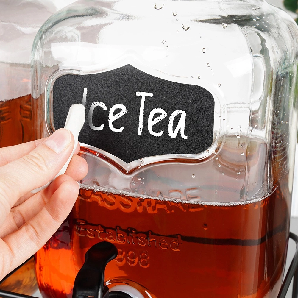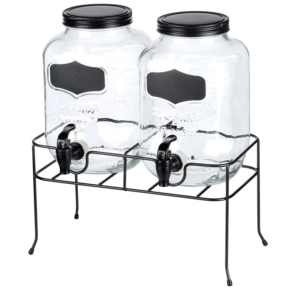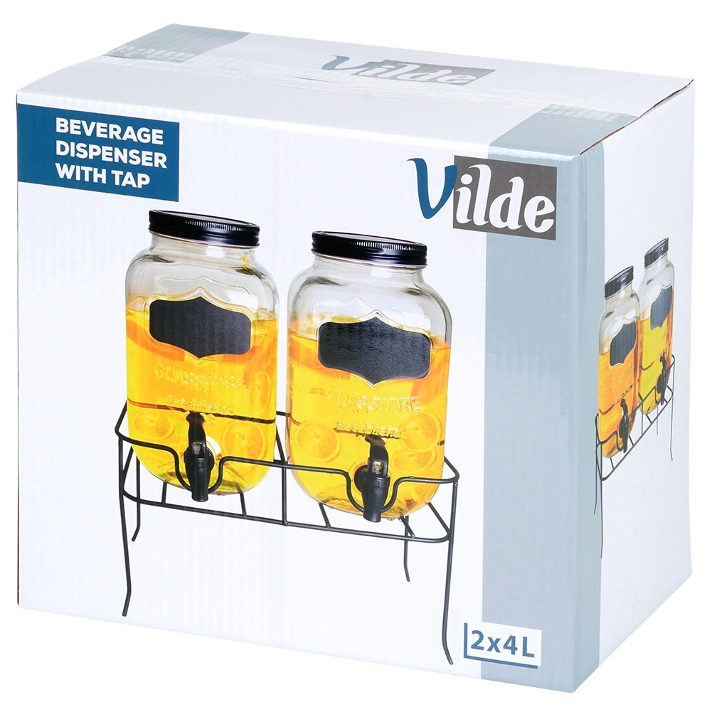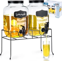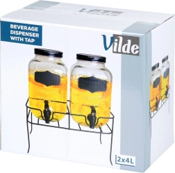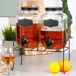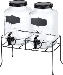 Acest set practic de două distribuitoare de băuturi aduce ordine și stil în orice servire. Fiecare borcan din sticlă are un volum de 4 l și este echipat cu un robinet din plastic cu garnitură pentru turnare lină. Datorită gurii largi, umplerea cu fructe sau cuburi de gheață este facilă, iar capacul protejează băutura de insecte și impurități. Suprafața tip tablă de pe partea frontală permite etichetarea cu cretă.