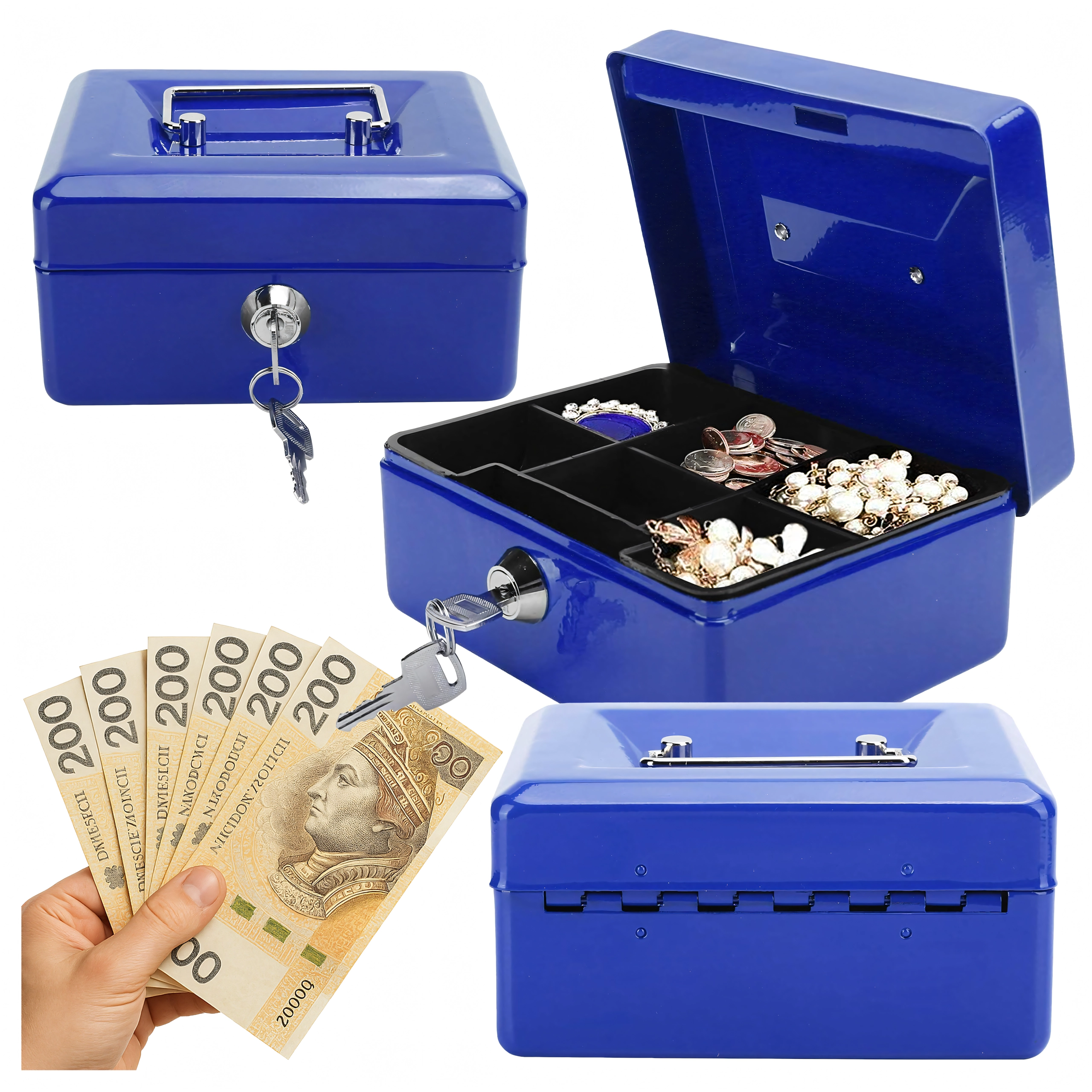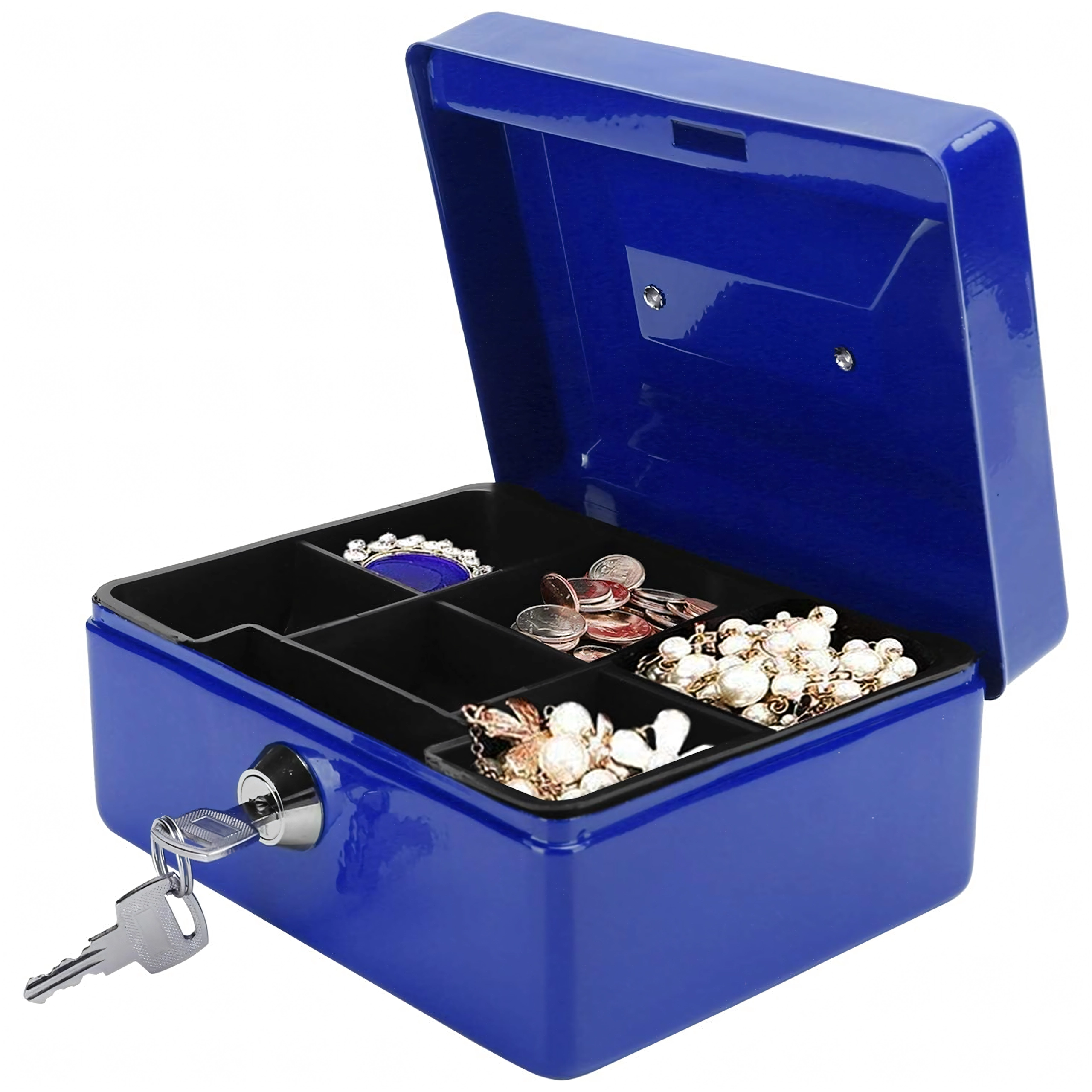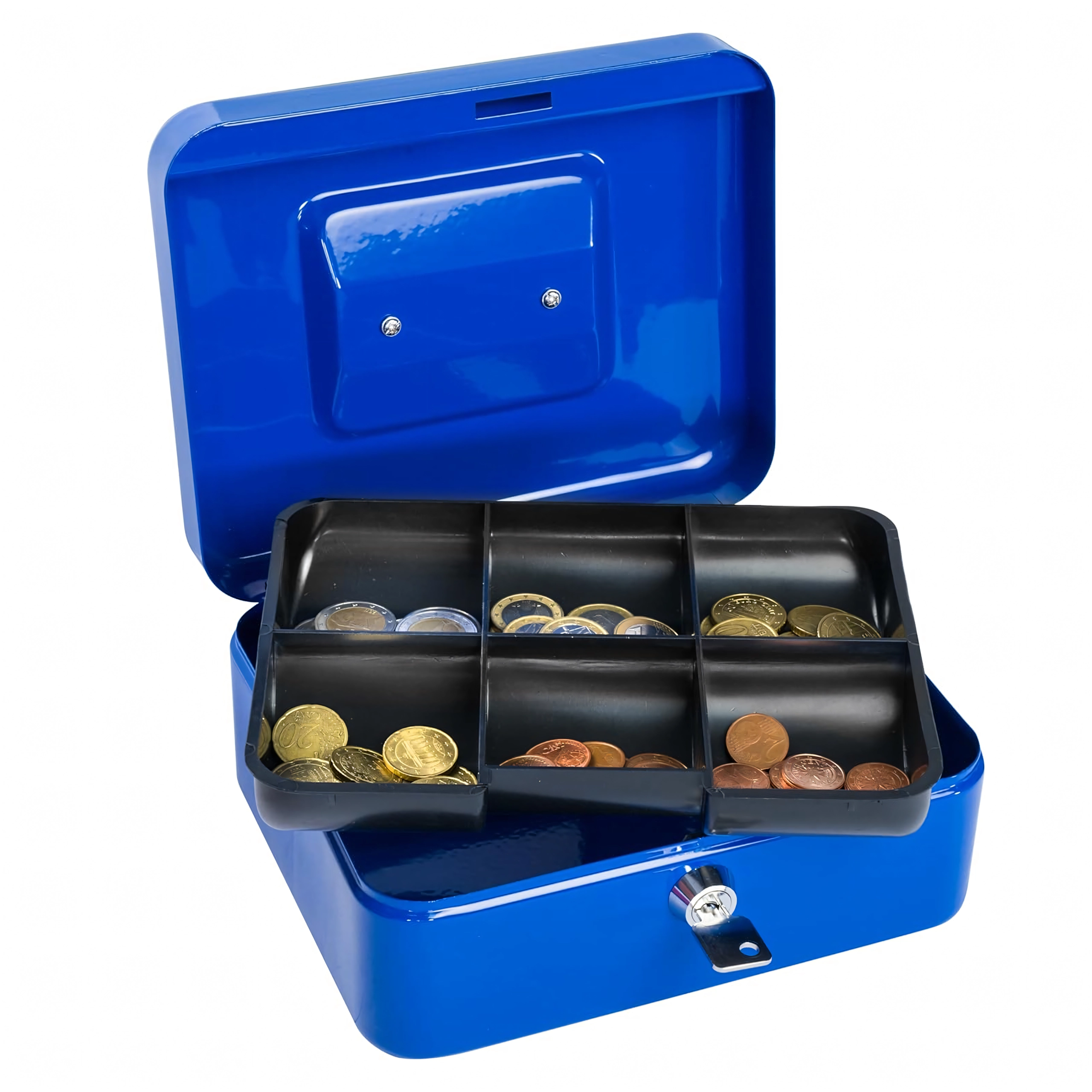 Cutie metalică de bani compactă, cu închidere pe cheie, păstrează în siguranță banii, bijuteriile sau actele. În interior are o tavă detașabilă cu compartimente clare pentru monede, pentru o organizare rapidă. Datorită construcției metalice robuste, mânerului practic și încuietorii fiabile, este ideală pentru casă, birou, târguri și vânzare la stand. Execuția metalică rezistentă, încuietoarea cu cheie și tava pentru monede asigură ordine și siguranță atât în deplasare, cât și pe loc.