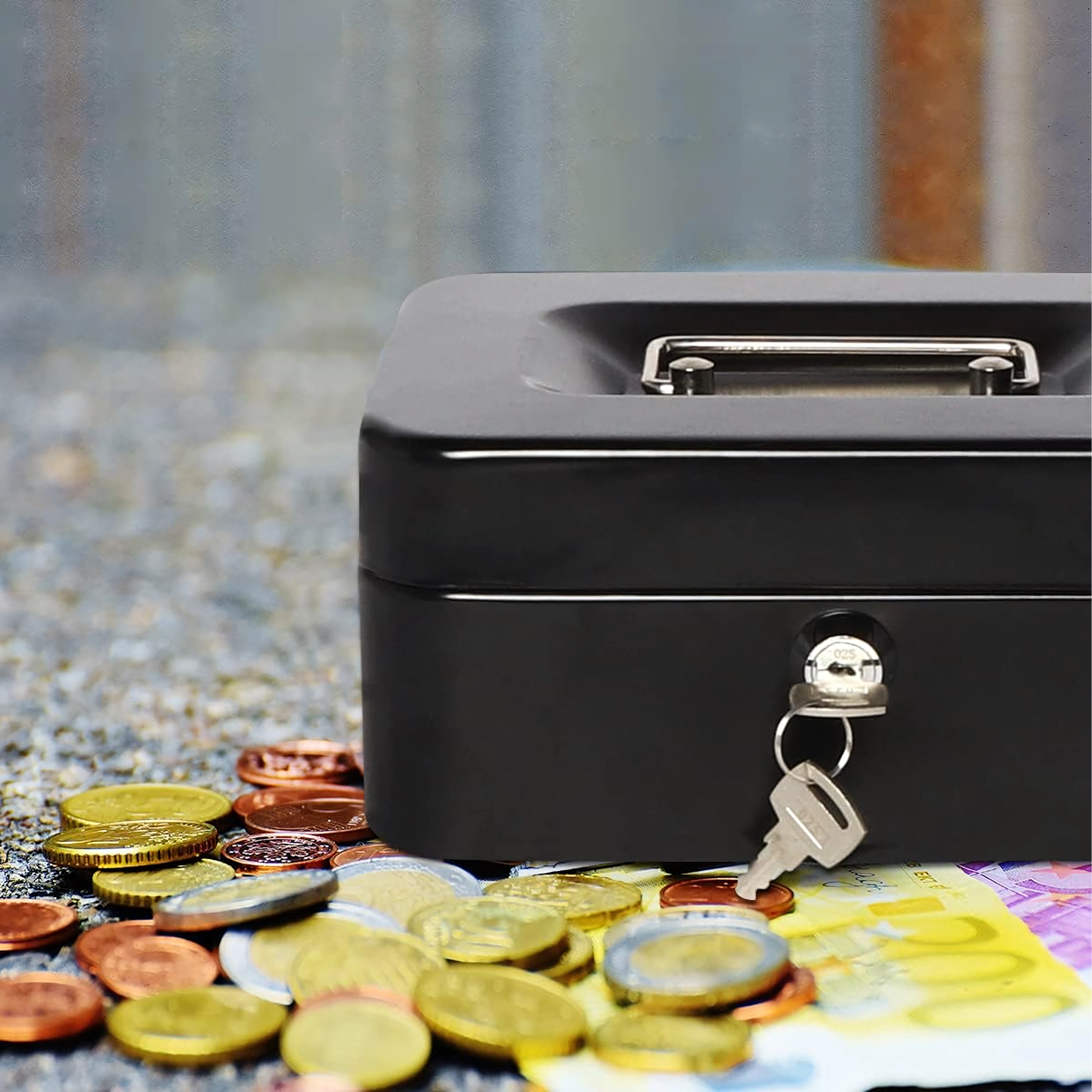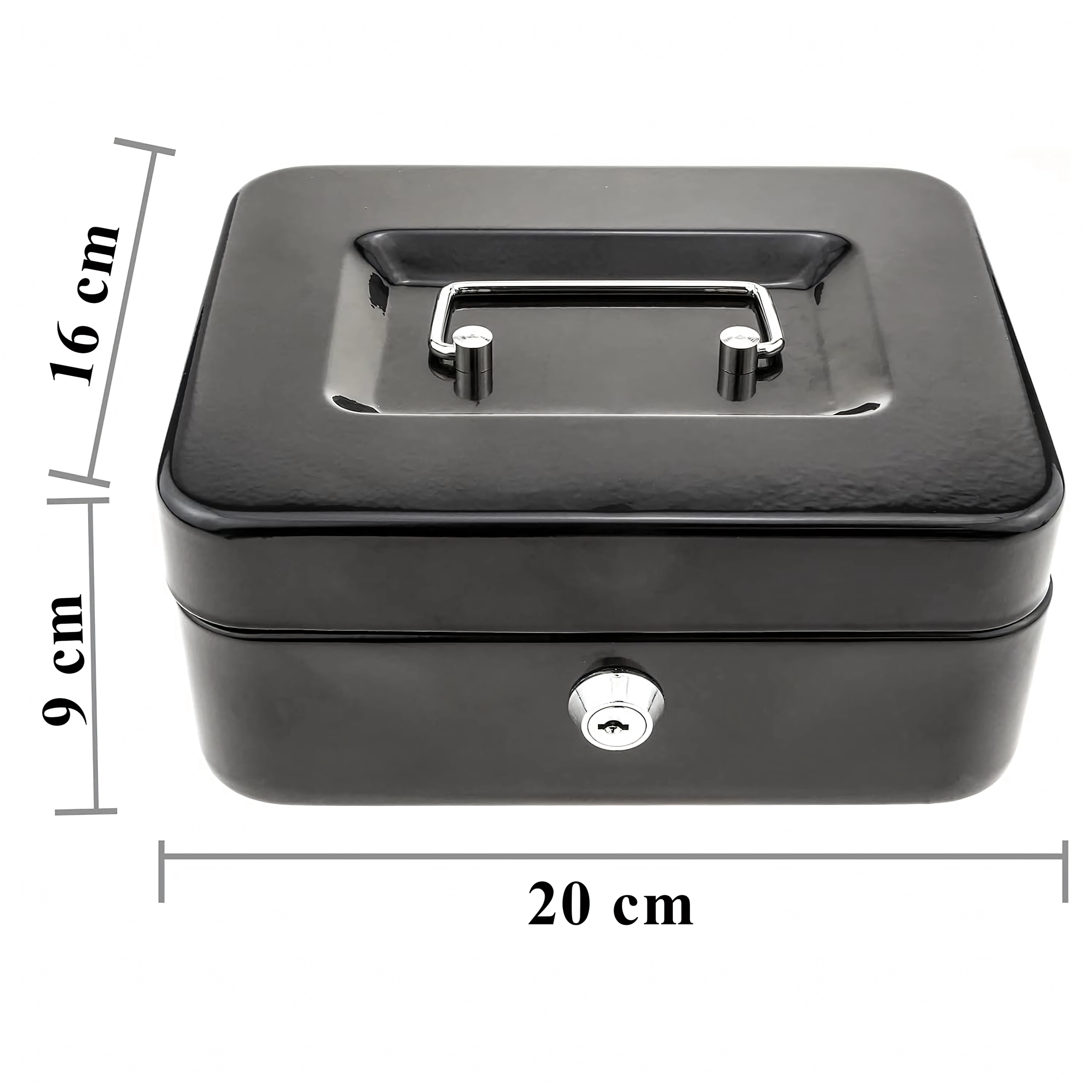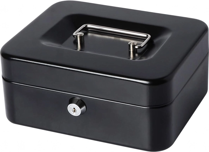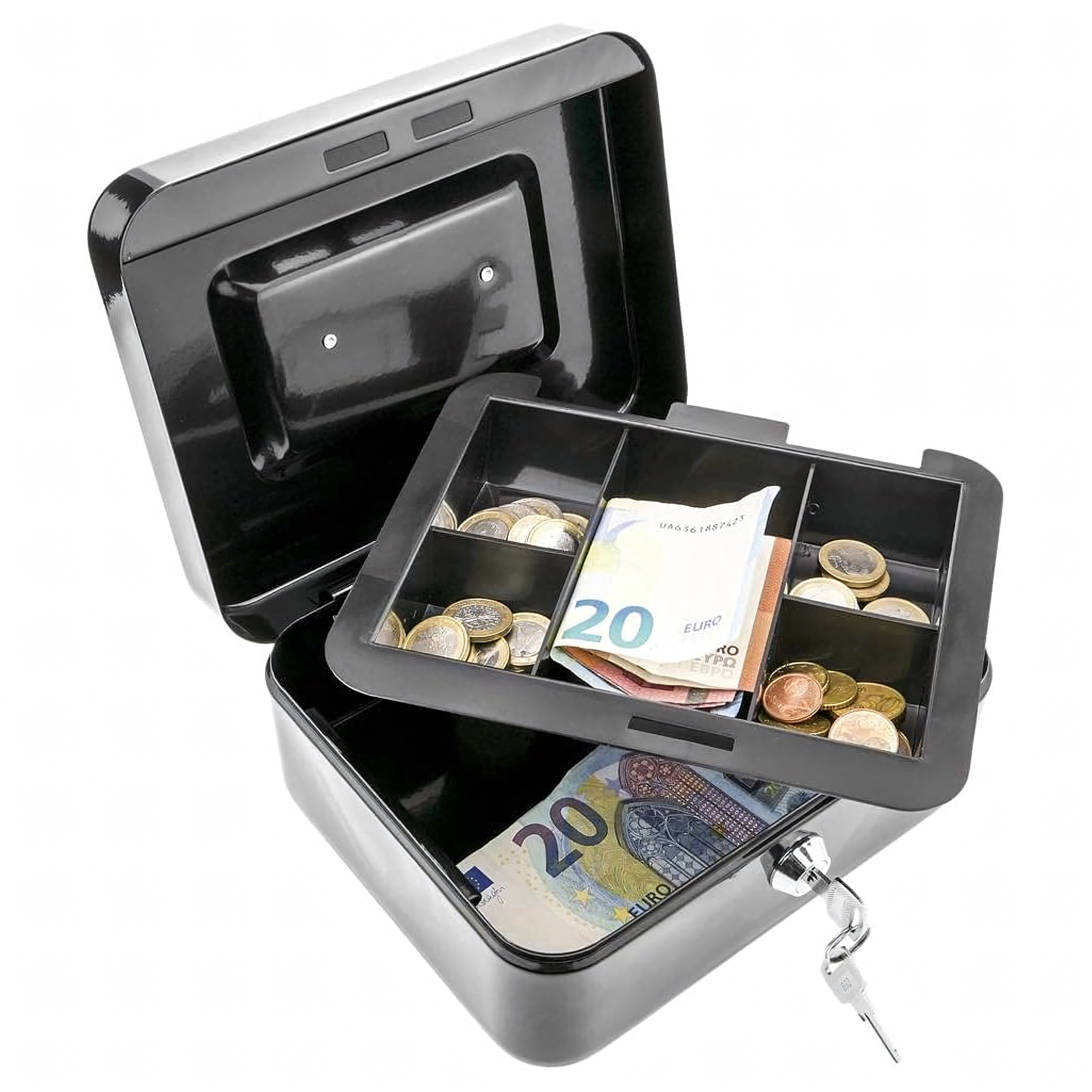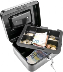 Tava din plastic detașabilă cu compartimente pentru monede simplifică sortarea și încasarea, iar dedesubt există loc pentru bancnote și documente. Corpul metalic rezistent cu balamale de calitate și mânerul confortabil garantează o durată lungă de viață și transport facil, fie la casă, la stand sau acasă.