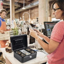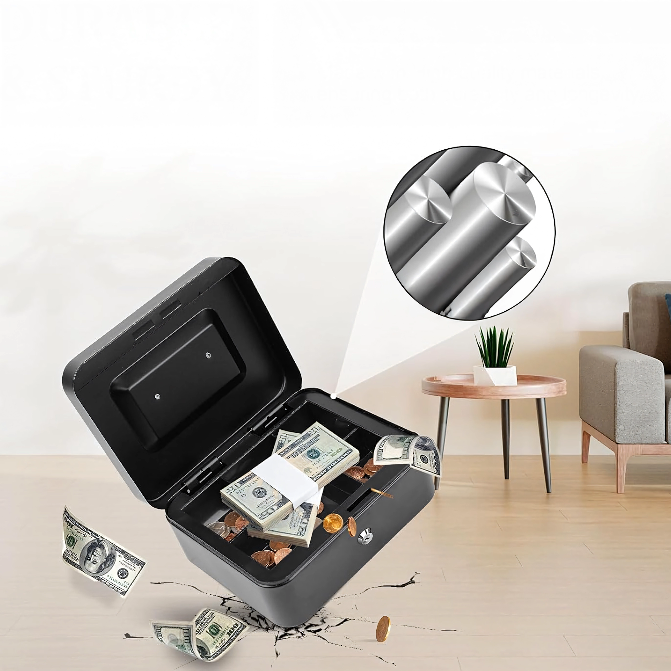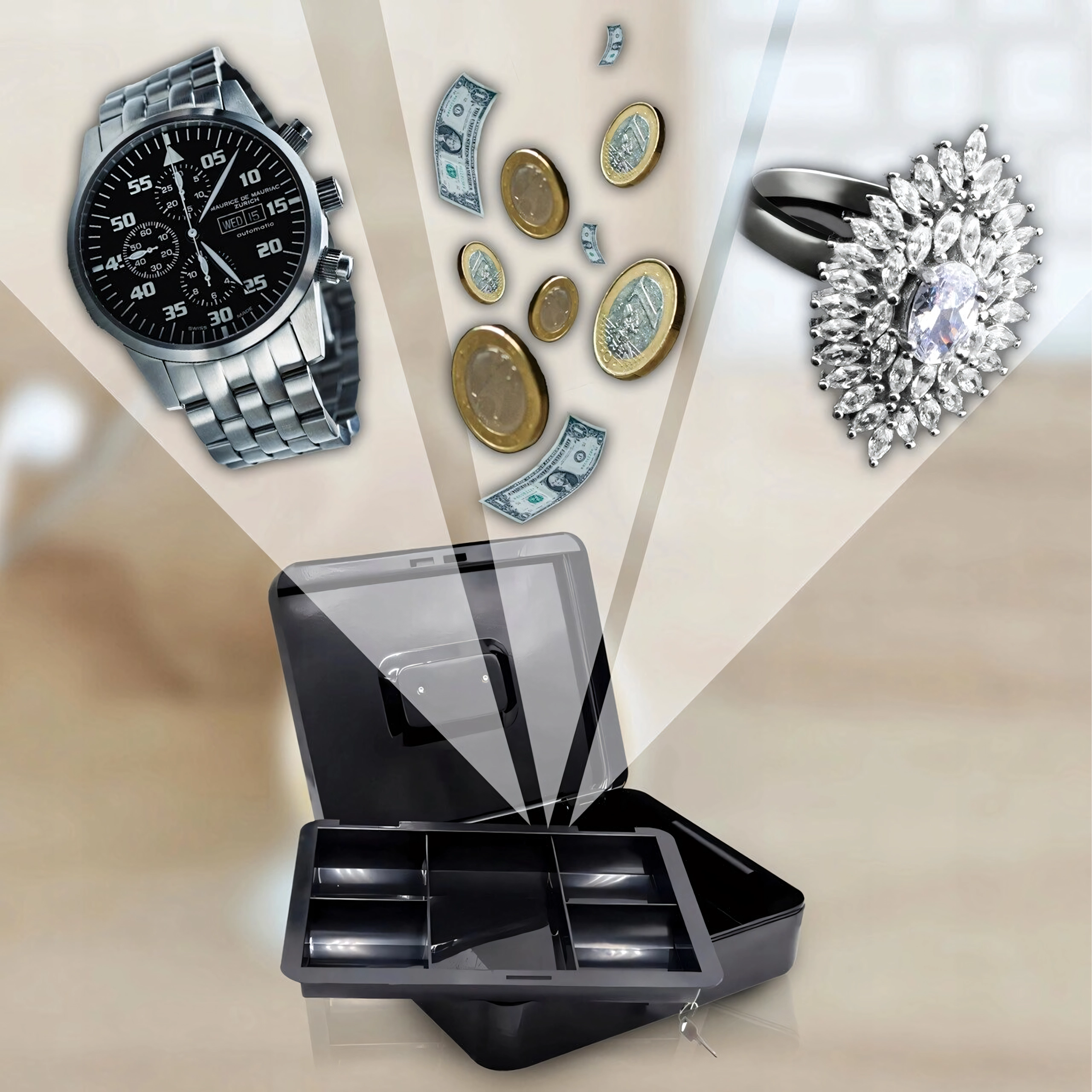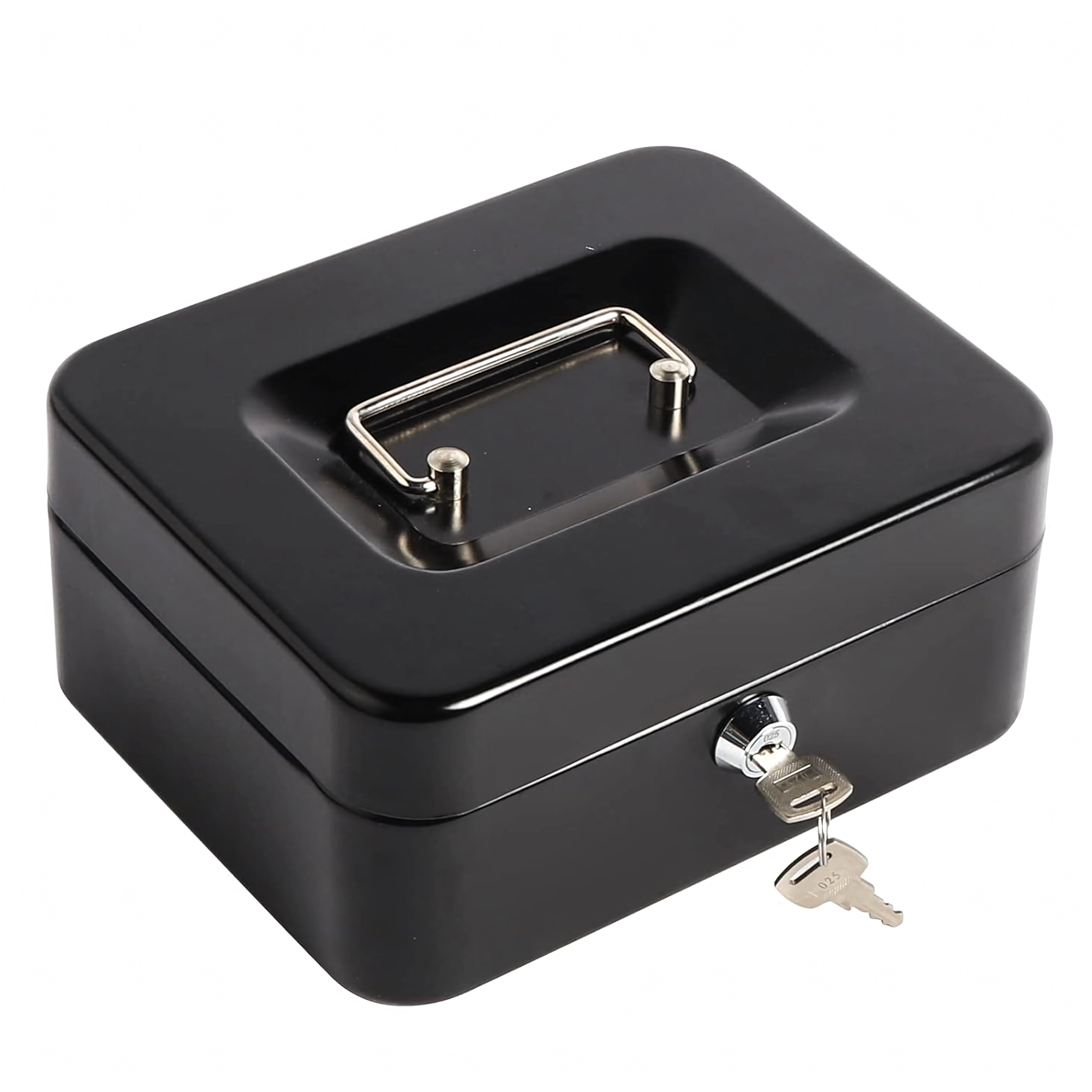 Tava din plastic detașabilă cu compartimente pentru monede simplifică sortarea și încasarea, iar dedesubt există loc pentru bancnote și documente. Corpul metalic rezistent cu balamale de calitate și mânerul confortabil garantează o durată lungă de viață și transport facil, fie la casă, la stand sau acasă.