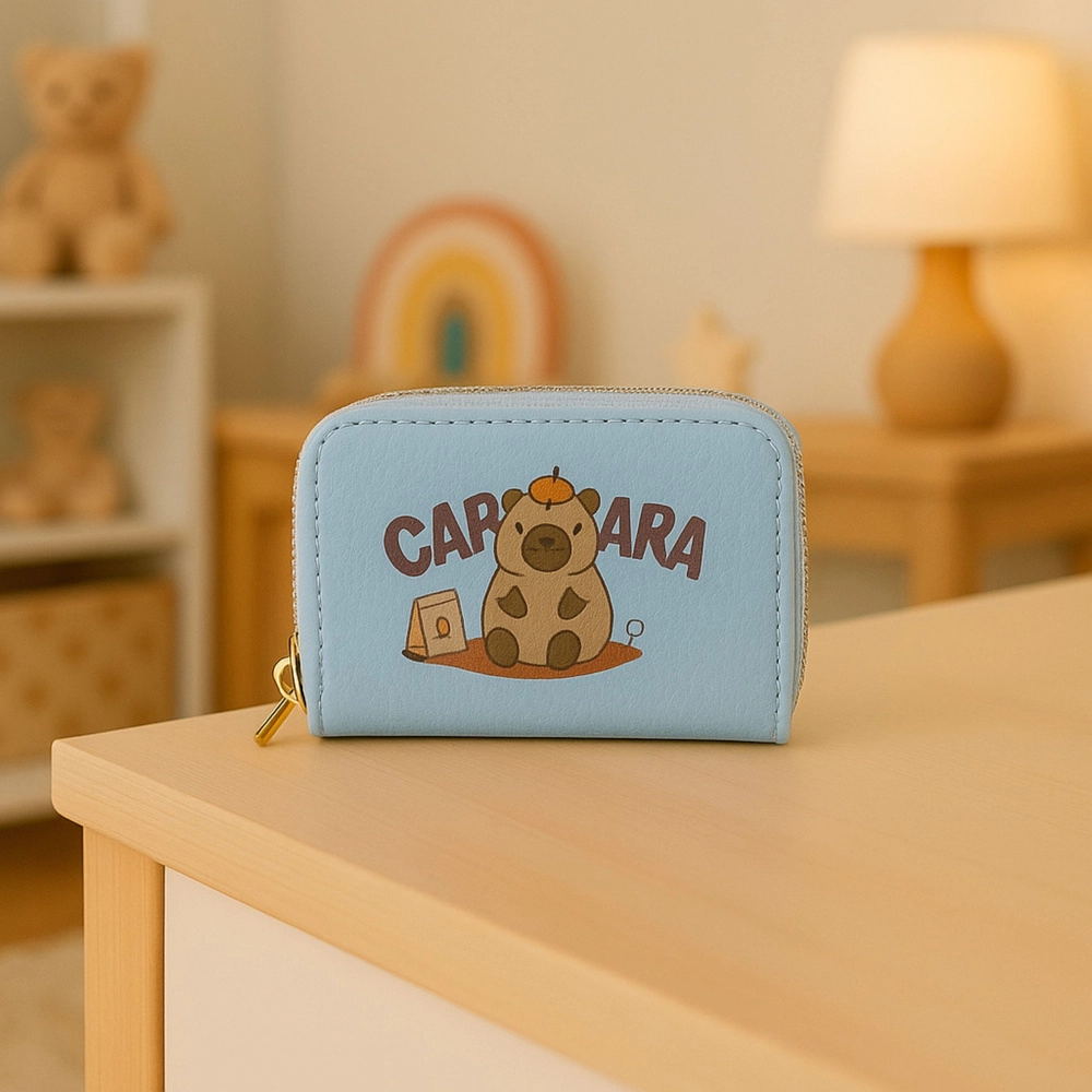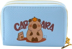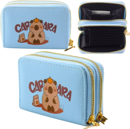 Acest portofel bleu îmbină designul jucăuș cu capibară și organizarea practică. Două fermoare aurii separă spațiul de depozitare, astfel încât să puteți distribui ușor carduri, numerar, monede și chitanțe. Structura internă tip armonică oferă o privire rapidă și acces comod.