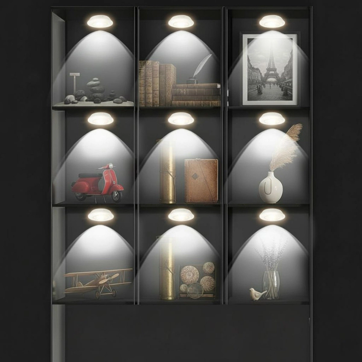 Set practic de șase lumini LED puck fără fir, cu telecomandă, pentru dulapuri, bucătărie, dormitor și scări. Oferă consum redus, dimensiuni compacte, dimming și temporizator de 30 de minute. Datorită alimentării pe baterii și montajului facil, este soluția ideală pentru iluminarea subtilă a rafturilor, nișelor și dulapurilor fără cabluri.