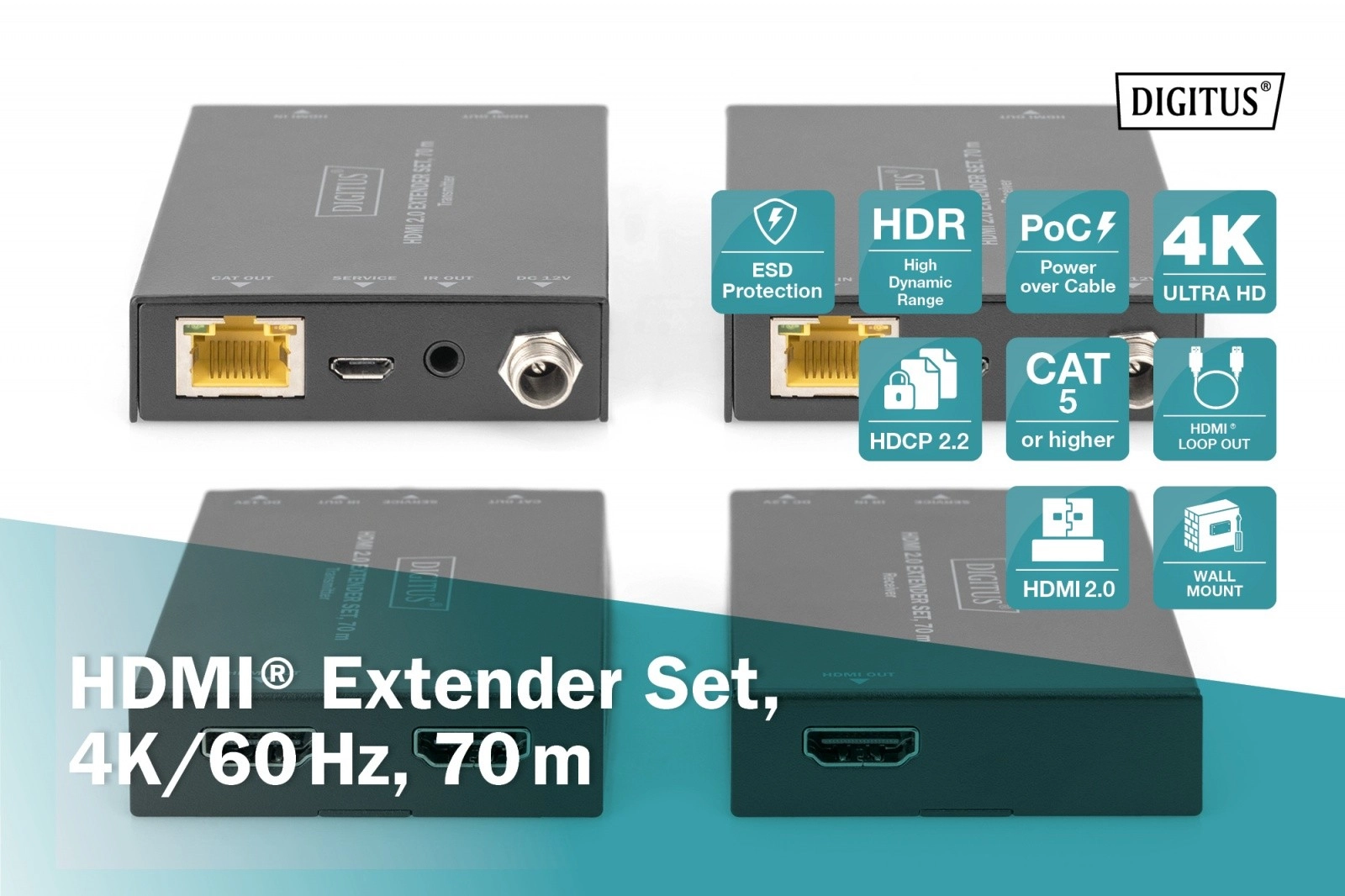 Extender HDMI profesional permite transmiterea imaginii pe o distanță de până la 70 m prin cablu CAT, cu suport pentru 4K 60 Hz (4:4:4), HDR și PoC (Power over Cable), unde este necesară alimentarea doar a unei singure unități. Oferă lățime de bandă video de 18 Gbps, auto-detectare EDID și HDMI Loop-Out pentru monitor local.