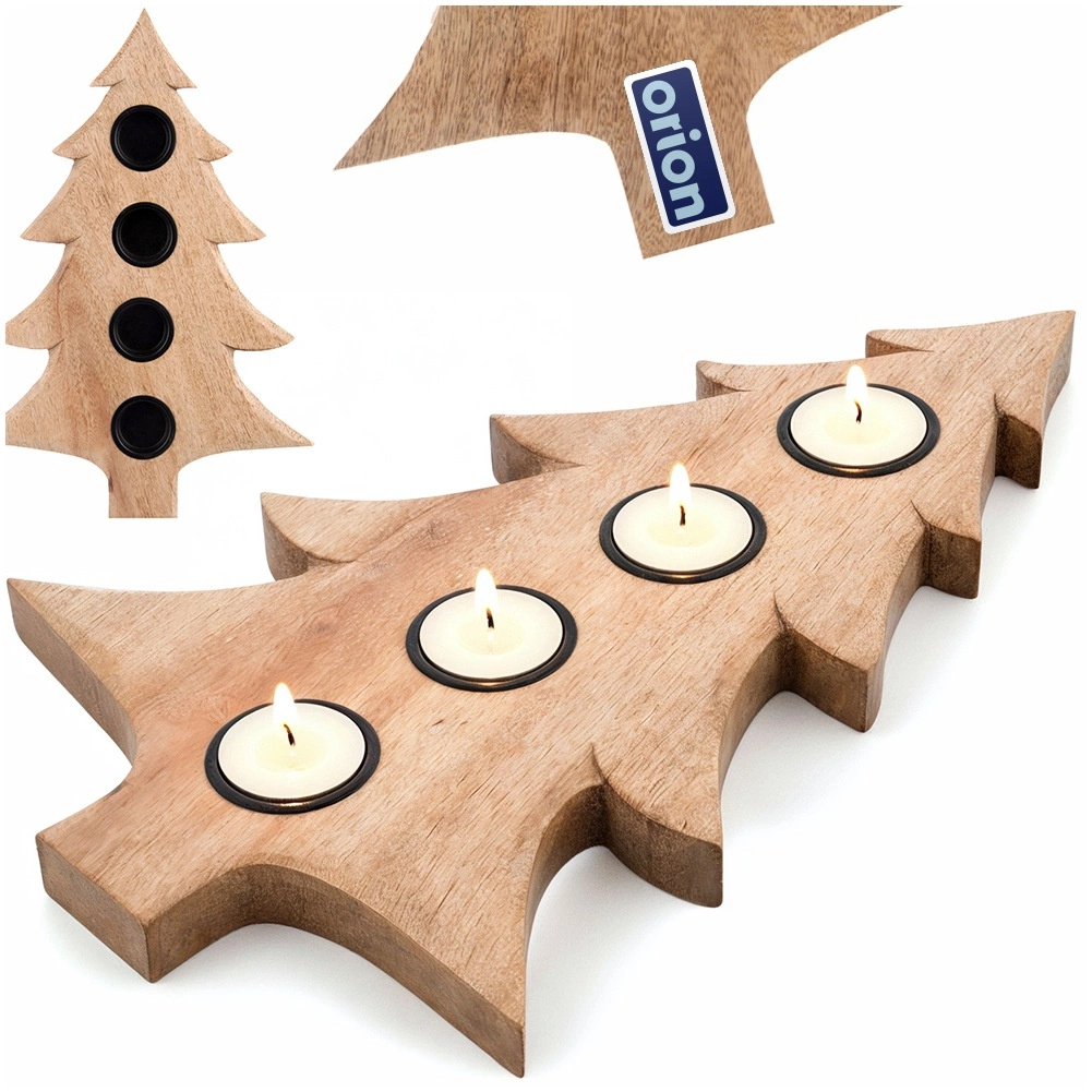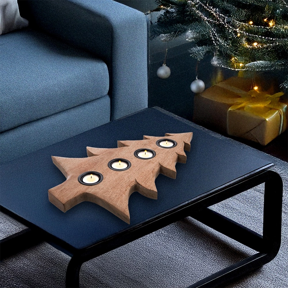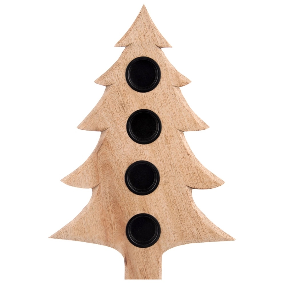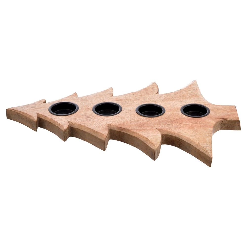 Creați acasă o atmosferă primitoare cu sfeșnicul din lemn în forma unui brad de Crăciun. Combinația de lemn de mango și cupe metalice negre pentru lumânările tip pastilă oferă un aspect elegant și, în același timp, asigură o utilizare sigură. Dimensiunile de 40 × 27,5 × 2,5 cm permit amplasarea sfeșnicului pe masă, comodă sau pervaz.
