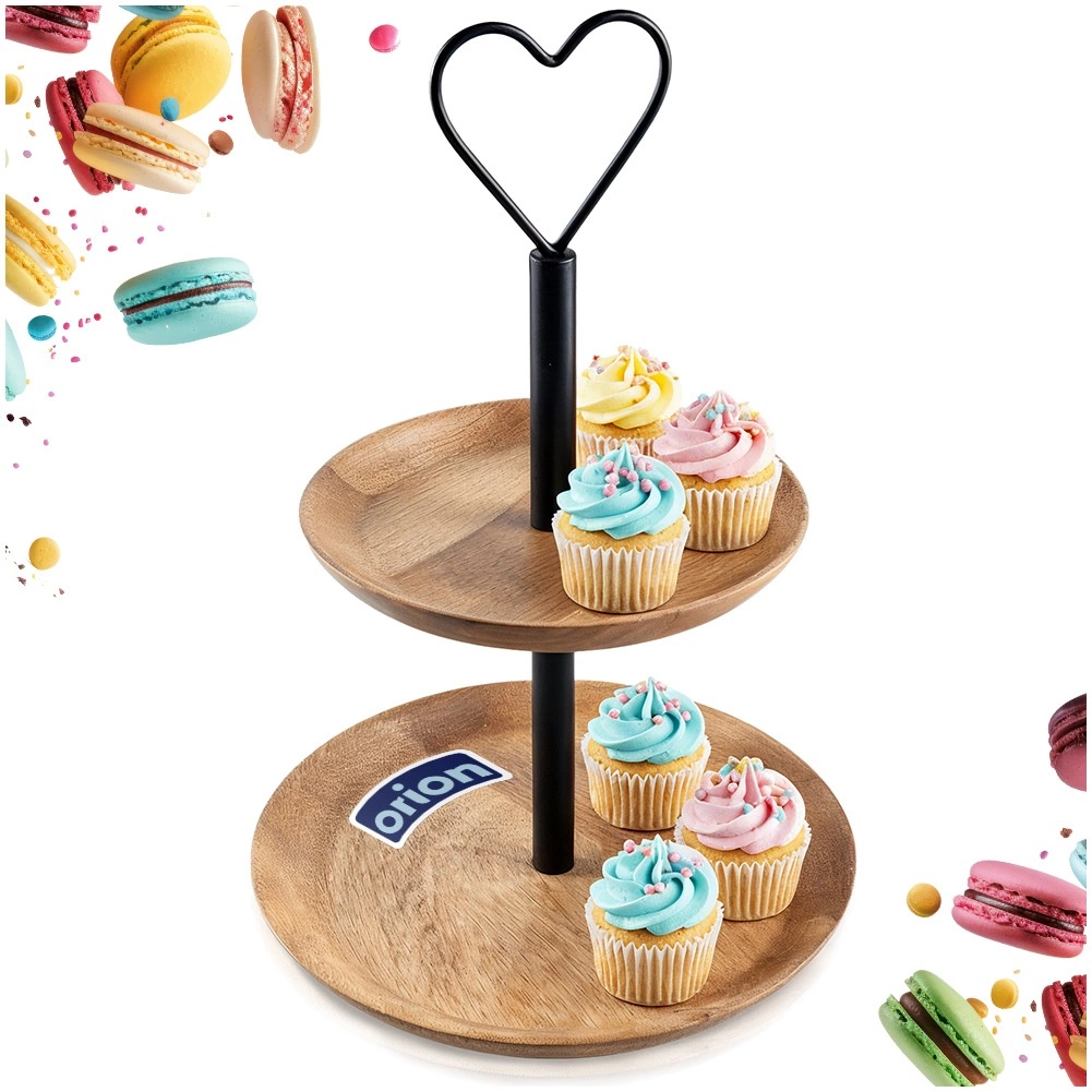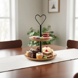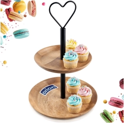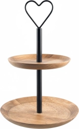 Platou elegant cu două etaje din lemn de mango, cu înălțimea de 37 cm și mâner metalic în formă de inimă, ideal pentru servirea deserturilor, fructelor și gustărilor. Datorită lemnului natural de mango este rezistent și stabil, iar cele două niveluri cu diametre de 25,5 cm și 20 cm asigură o prezentare clară. Construcția pliabilă și transportul facil sunt potrivite atât pentru uz casnic, cât și profesional.