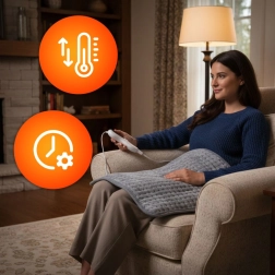 Datorită celor 10 niveluri reglabile de temperatură (30–48 °C) alegi ușor căldură blândă sau încălzire mai intensă. Temporizatorul cu 3 opțiuni (45/90/120 min) asigură oprirea automată pentru utilizare sigură chiar și când ațipești.