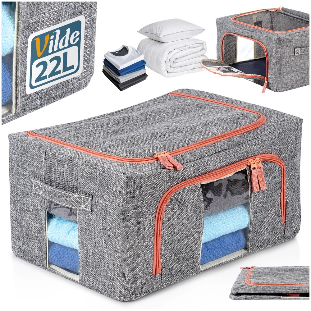 Mențineți ordinea în șifonier și sub pat. Organizatorul textil rezistent, din poliester gri melanj, cu fermoar contrastant, oferă depozitare curată și sigură pentru lenjeria de pat și hainele de sezon. Fereastra transparentă permite verificarea imediată a conținutului fără deschidere, iar cadrul metalic menține forma, pentru a preveni tasarea cutiei.