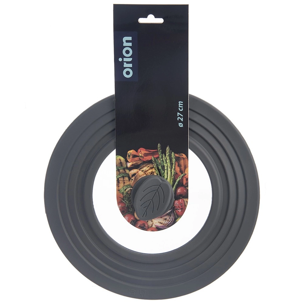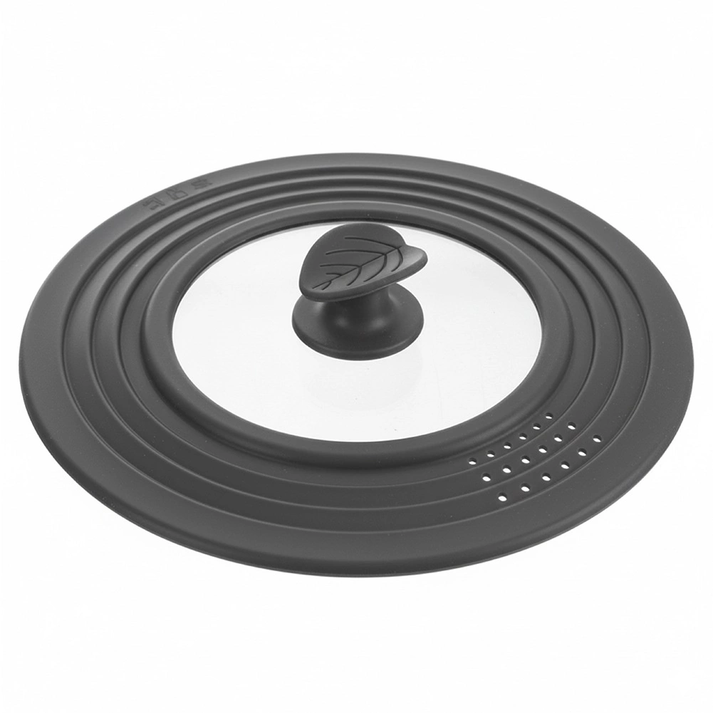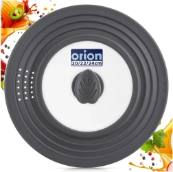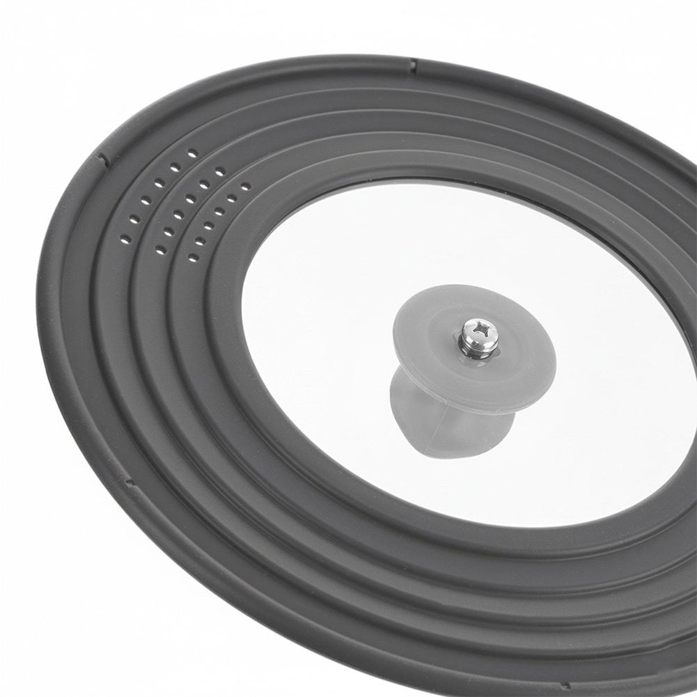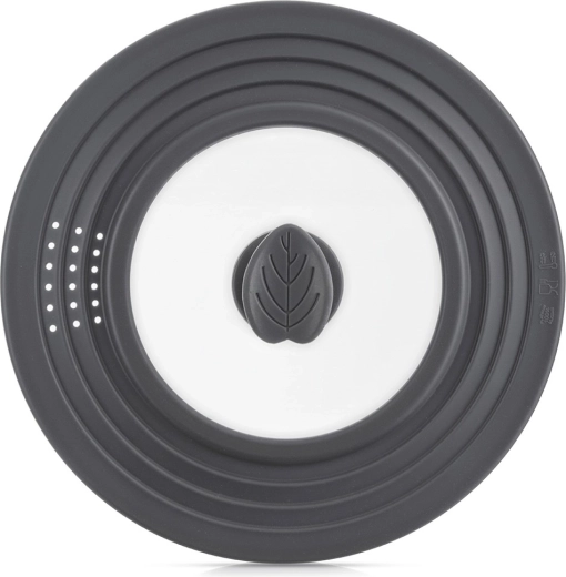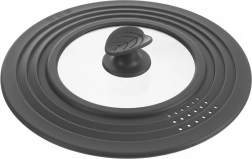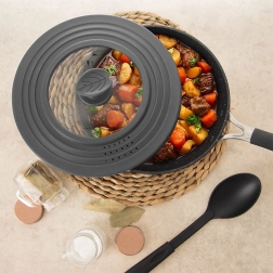 Acest capac universal 3‑în‑1 înlocuiește trei capace separate și economisește spațiu în bucătăria dvs. Datorită sticlei rezistente și marginii din silicon gri, aderă perfect la marginile oalelor și tigăilor, le protejează împotriva deteriorării și asigură etanșeitatea. Sticla transparentă permite controlul gătirii fără a ridica capacul.
