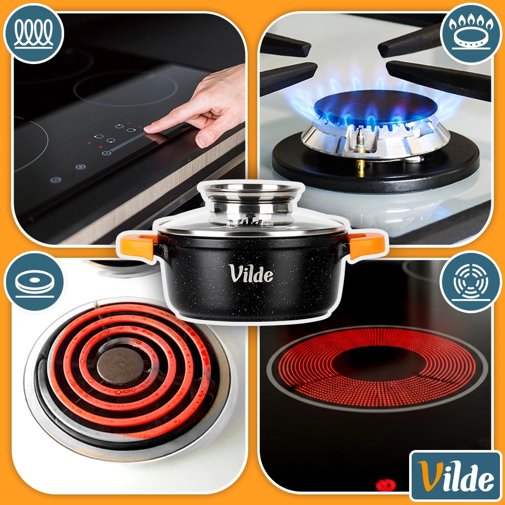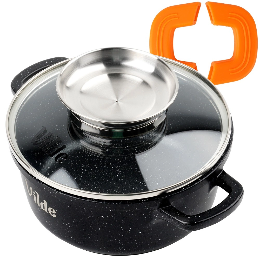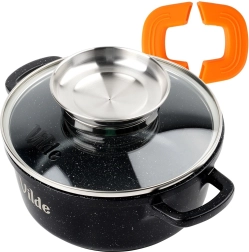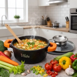 Husele ergonomice din silicon pentru mânere asigură o prindere fermă și sigură chiar și la temperaturi ridicate. Fundul gros cu plăcuță pentru inducție distribuie uniform căldura, scurtând timpul de preparare și crescând eficiența. Oala este potrivită pentru toate tipurile de plite și pentru mașina de spălat vase.