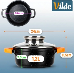 Oală compactă din granit cu volum de 1,2 l și diametru de 16 cm, cu capac de sticlă și mânere din silicon pentru o prindere sigură. Stratul antiaderent din granit rezistent permite gătirea cu minimum de grăsime, iar capacul cu dozator integrat facilitează turnarea vinului sau a apei fără a ridica capacul. Potrivită pentru gaz, electric, ceramică și inducție și pentru cuptor până la 200 °C (fără capac).