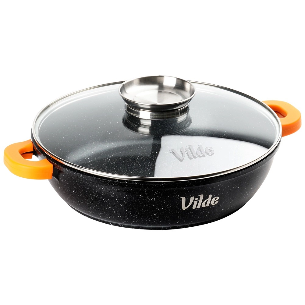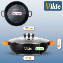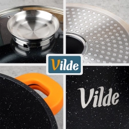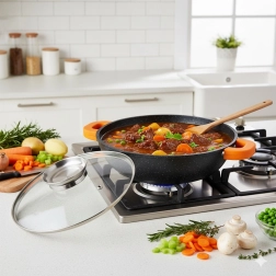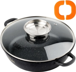 Tigaie adâncă practică, cu un volum de 2,1 l, cu capac de sticlă cu dozator și suprafață antiaderentă din granit pentru gătit cu minimum de ulei. Compatibilă cu toate tipurile de plite, inclusiv cu inducție, potrivită și pentru cuptor fără capac până la 200 °C. Sunt incluse mâneci din silicon antiderapante pentru mânere, pentru transport în siguranță.