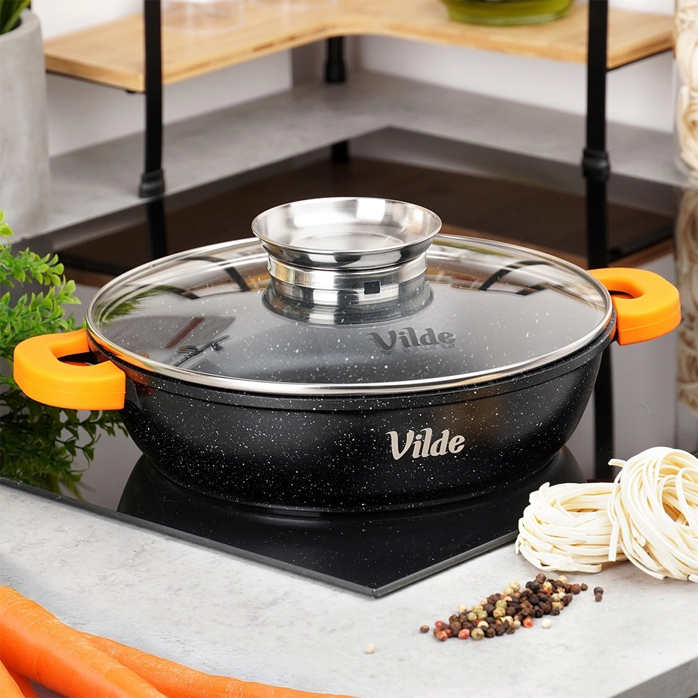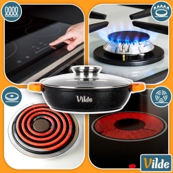 Fundul gros, multistrat, distribuie uniform căldura și este potrivit pentru gaz, electric, vitroceramic și inducție.