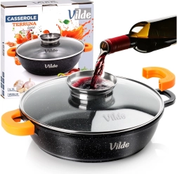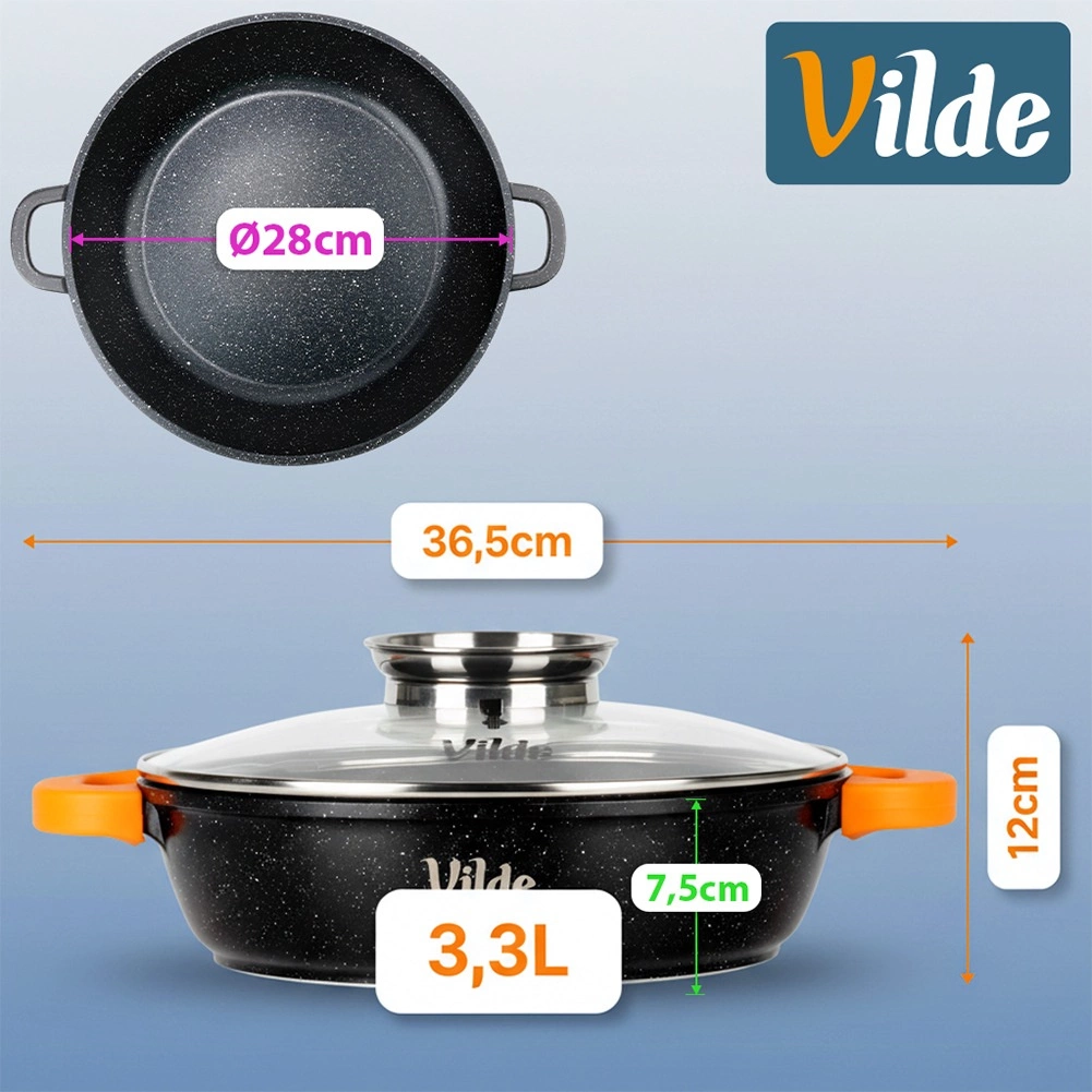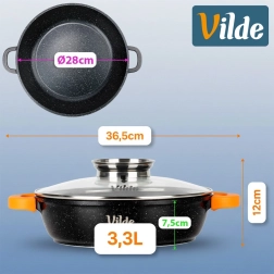 Tigaia adâncă de 28 cm, cu volum de 3,3 l, este ideală pentru gătitul zilnic: prăjire, înăbușire, gratinare, sosuri, risotto, paste și preparate la oală unică. Corpul rezistent din aluminiu cu strat antiaderent din granit permite gătitul cu minimum de grăsime și facilitează curățarea. Capacul din sticlă etanșează bine, iar datorită dozatorului integrat în mâner puteți adăuga vin sau apă fără a ridica capacul.
