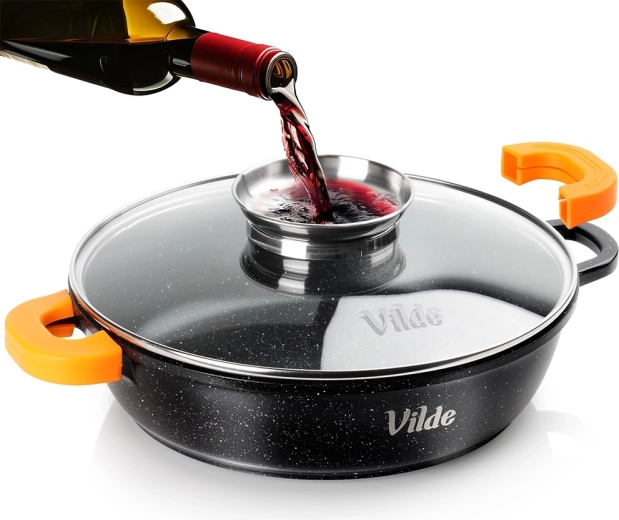 Mânerul lat din oțel inoxidabil al capacului funcționează ca un dozator practic – adăugați lichide fără a ridica capacul. Gătitul devine mai rapid, mai economic și uniform.