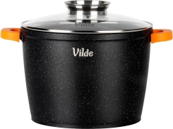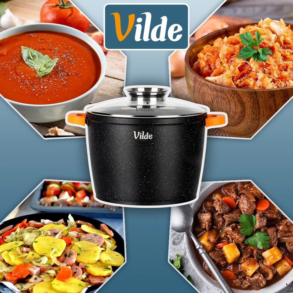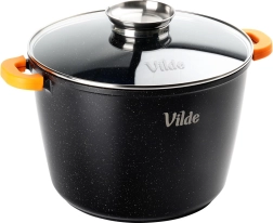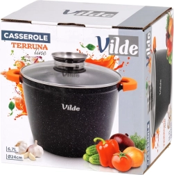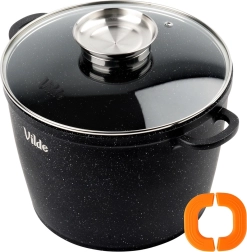 Oala din granit cu capacitate mare Vilde TERRUNA AROMA, cu un volum de 6,7 l și diametru de 24 cm, este ideală pentru supe, gulașuri și înăbușirea cărnii. Datorită stratului antiaderent din granit gătiți cu minimum de grăsime, iar capacul din sticlă cu dozator permite adăugarea de lichide fără a ridica capacul, în timp ce mânecușile din silicon antiderapante de pe mânere asigură o prindere sigură. Potrivit pentru gaz, electric, ceramic și inducție, la cuptor până la 200 °C (fără capac) și pentru mașina de spălat vase.